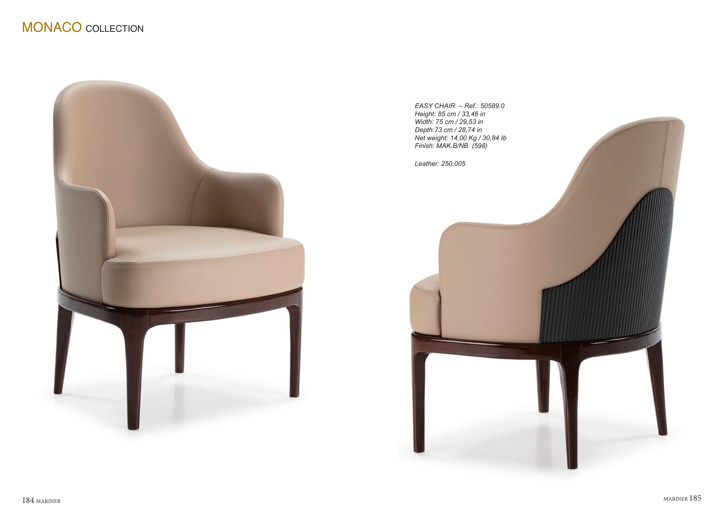 MARINER 185 184 MARINER MONACO COLLECTION Leather: 250.005 EASY CHAIR – Ref.: 50589.0 Height: 85 cm / 33,46 in Width: 75 cm / 29,53 in Depth:73 cm / 28,74 in Net weight: 14,00 Kg / 30,84 Ib Finish: MAK.B/NB (598)