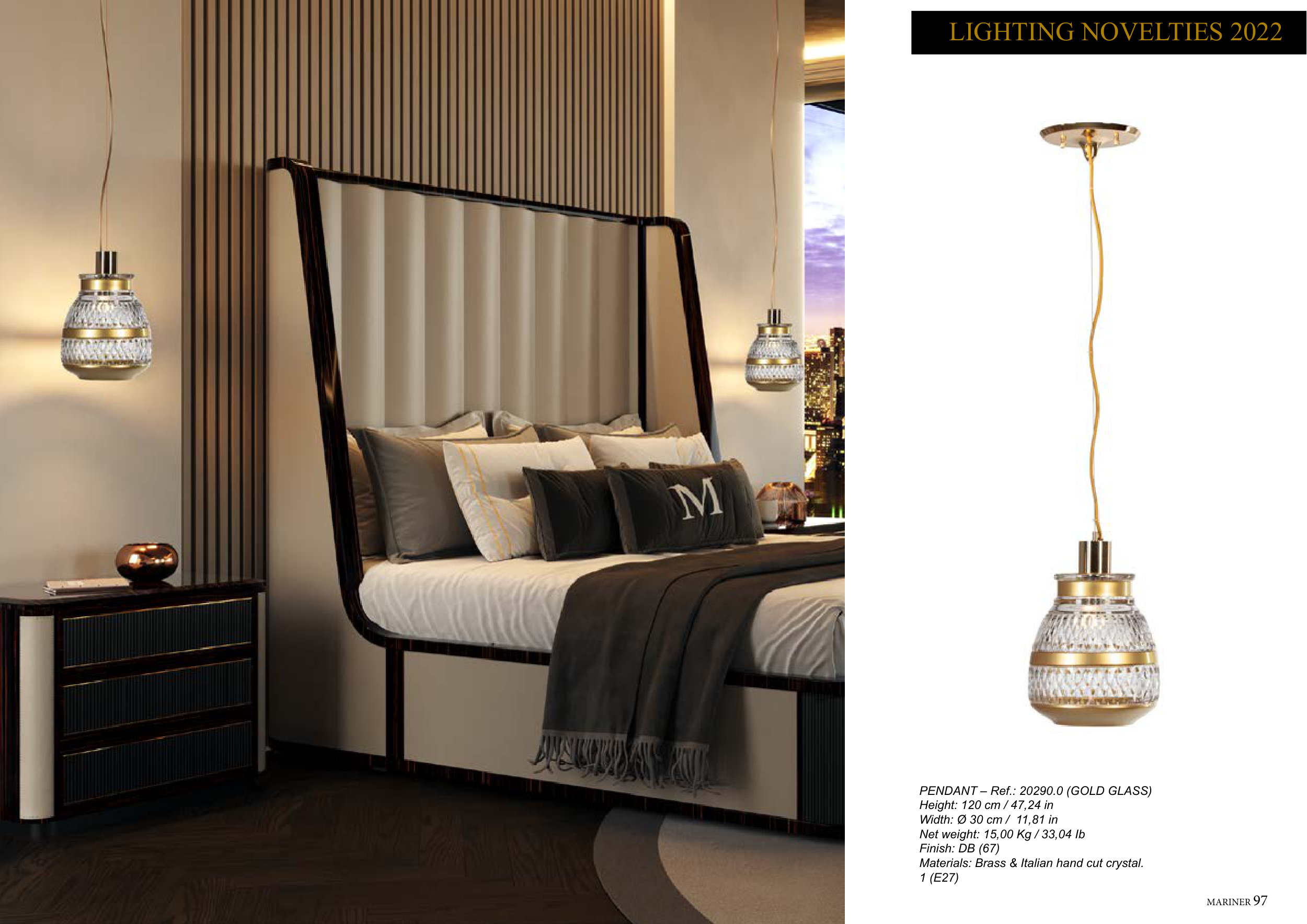 MARINER 97 96 MARINER PENDANT – Ref.: 20290.0 (GOLD GLASS) Height: 120 cm / 47,24 in Width: Ø 30 cm / 11,81 in Net weight: 15,00 Kg / 33,04 Ib Finish: DB (67) Materials: Brass & Italian hand cut crystal. 1 (E27) LIGHTING NOVELTIES 2022