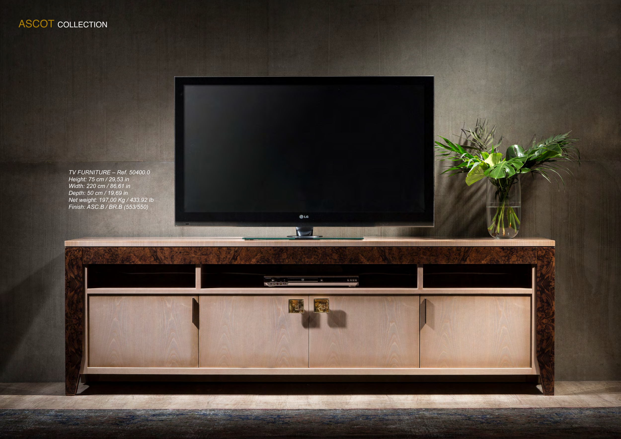 272 MARINER MARINER 273 TV FURNITURE – Ref. 50400.0 Height: 75 cm / 29,53 in Width: 220 cm / 86,61 in Depth: 50 cm / 19,69 in Net weight: 197,00 Kg / 433,92 Ib Finish: ASC.B / BR.B (553/550) ASCOT COLLECTION
