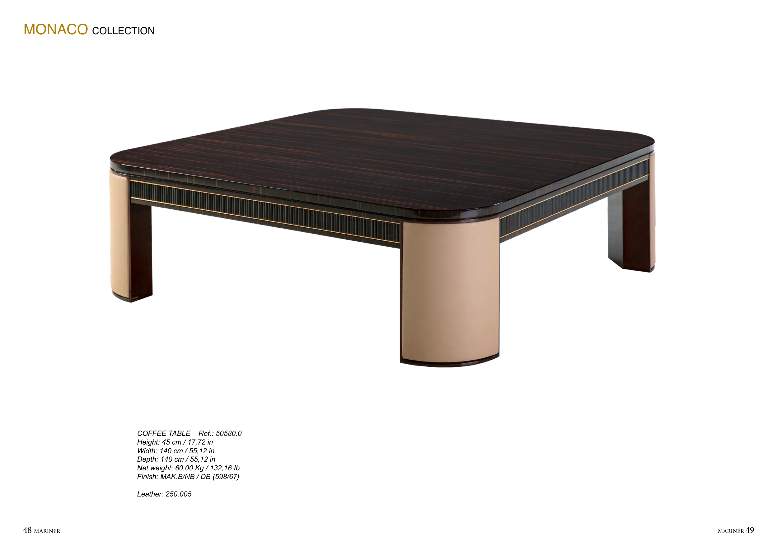 48 MARINER MARINER 49 Leather: 250.005 COFFEE TABLE – Ref.: 50580.0 Height: 45 cm / 17,72 in Width: 140 cm / 55,12 in Depth: 140 cm / 55,12 in Net weight: 60,00 Kg / 132,16 Ib Finish: MAK.B/NB / DB (598/67) MONACO COLLECTION