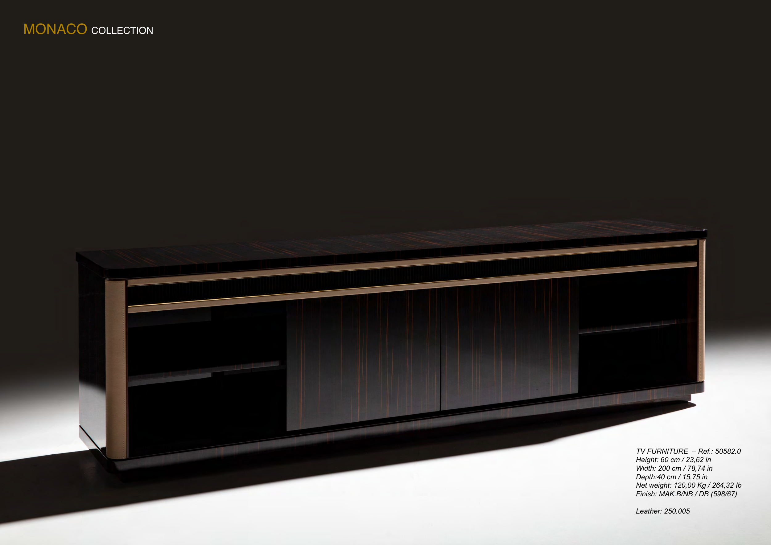 58 MARINER MARINER 59 MONACO COLLECTION Leather: 250.005 TV FURNITURE – Ref.: 50582.0 Height: 60 cm / 23,62 in Width: 200 cm / 78,74 in Depth:40 cm / 15,75 in Net weight: 120,00 Kg / 264,32 Ib Finish: MAK.B/NB / DB (598/67)