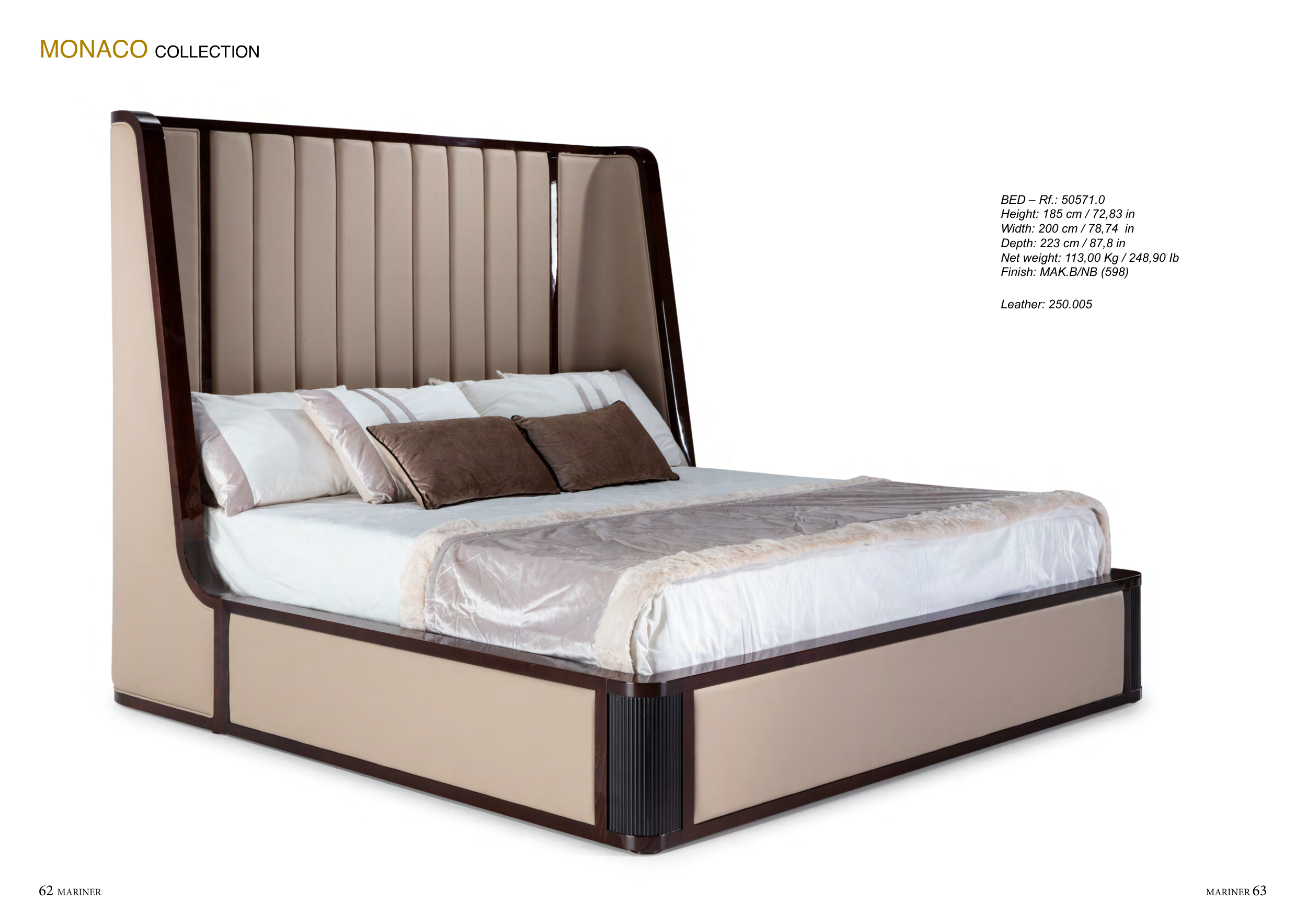 62 MARINER MARINER 63 MONACO COLLECTION Leather: 250.005 BED – Rf.: 50571.0 Height: 185 cm / 72,83 in Width: 200 cm / 78,74 in Depth: 223 cm / 87,8 in Net weight: 113,00 Kg / 248,90 Ib Finish: MAK.B/NB (598)