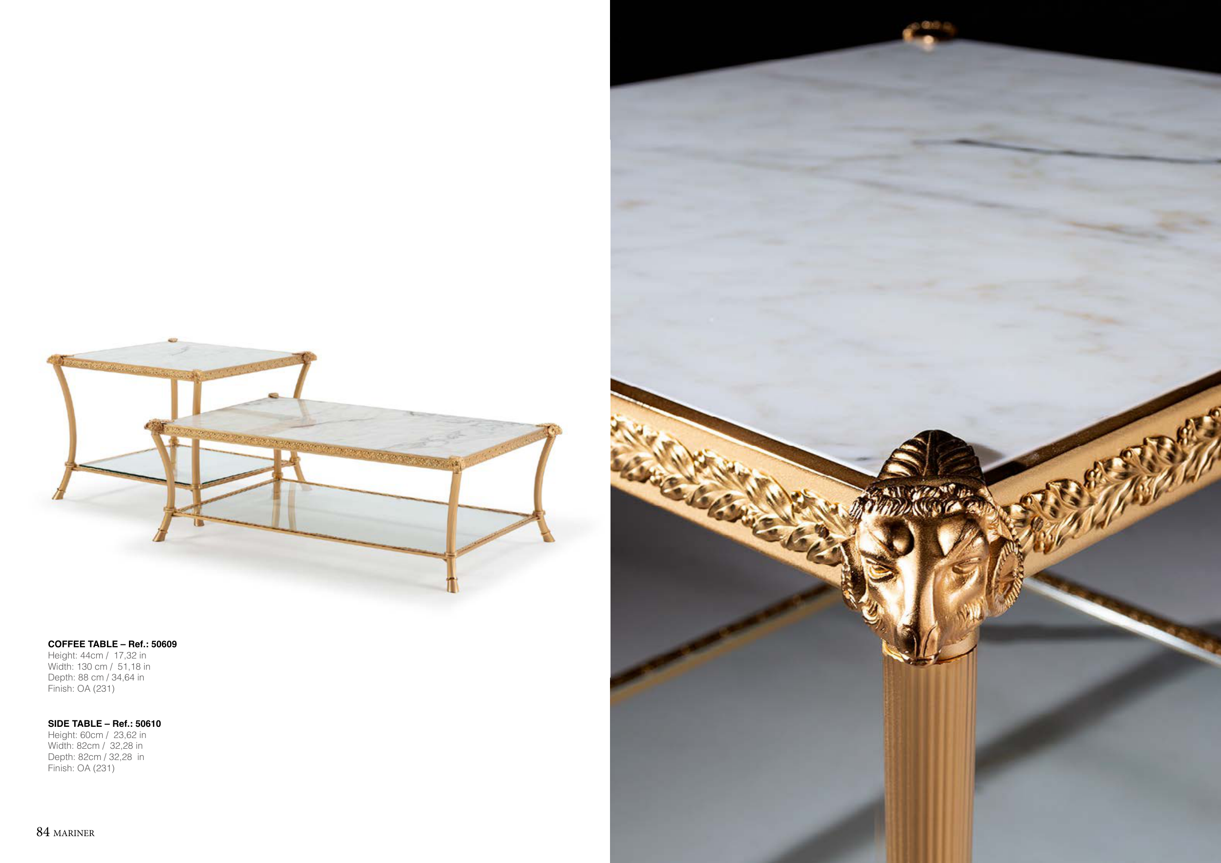 84 MARINER MARINER 85 COFFEE TABLE – Ref.: 50609 Height: 44cm / 17,32 in Width: 130 cm / 51,18 in Depth: 88 cm / 34,64 in Finish: OA (231) SIDE TABLE – Ref.: 50610 Height: 60cm / 23,62 in Width: 82cm / 32,28 in Depth: 82cm / 32,28 in Finish: OA (231)