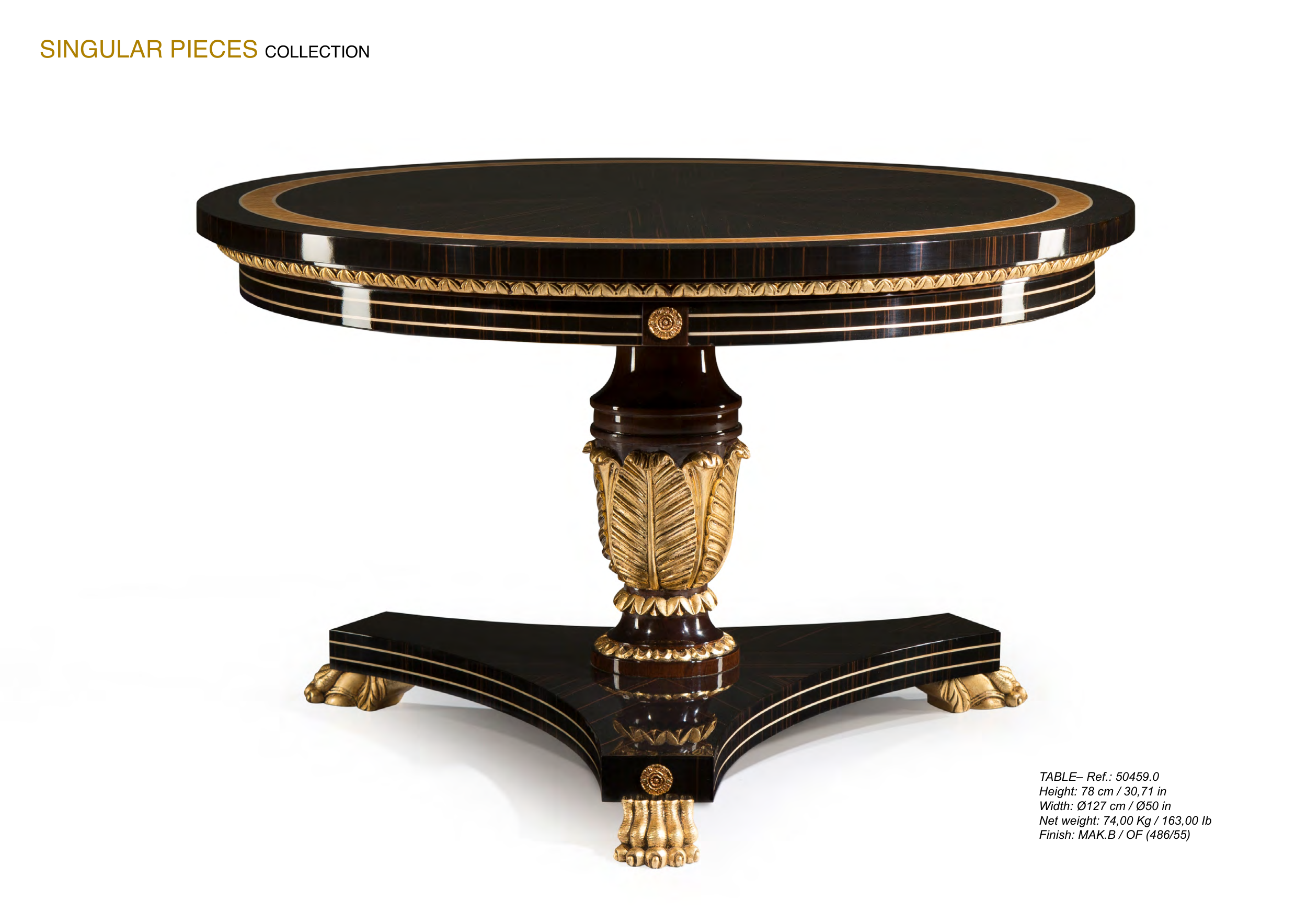 82 MARINER MARINER 83 SINGULAR PIECES COLLECTION TABLE– Ref.: 50459.0 Height: 78 cm / 30,71 in Width: Ø127 cm / Ø50 in Net weight: 74,00 Kg / 163,00 Ib Finish: MAK.B / OF (486/55)