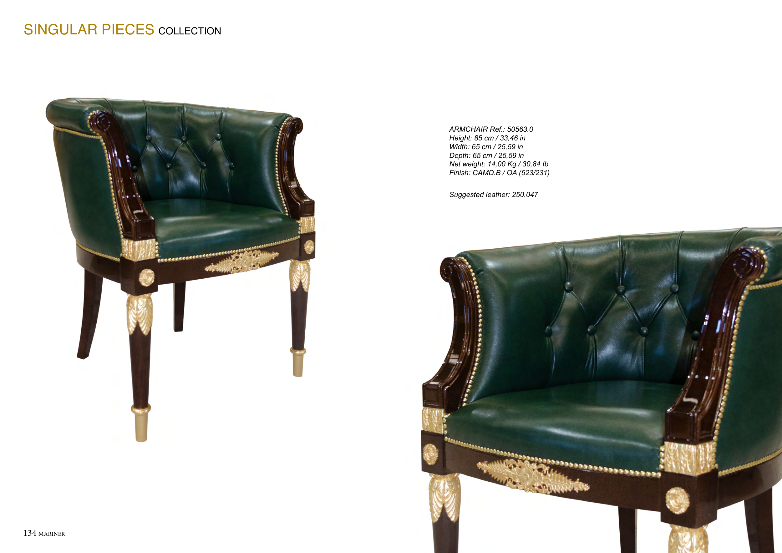 134 MARINER MARINER 135 SINGULAR PIECES COLLECTION ARMCHAIR Ref.: 50563.0 Height: 85 cm / 33,46 in Width: 65 cm / 25,59 in Depth: 65 cm / 25,59 in Net weight: 14,00 Kg / 30,84 Ib Finish: CAMD.B / OA (523/231) Suggested leather: 250.047
