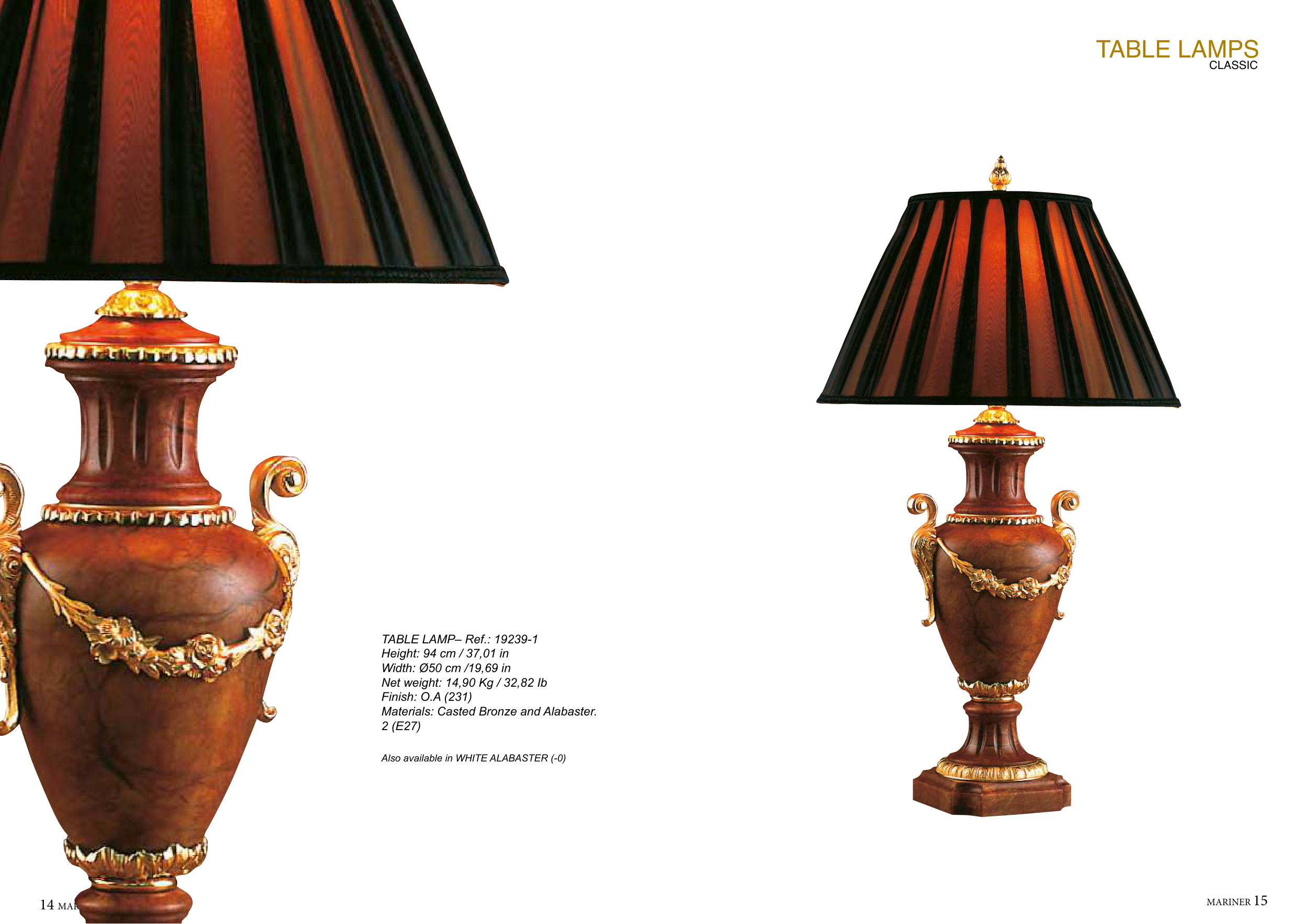 MARINER 15 14 MARINER TABLE LAMP– Ref.: 19239-1 Height: 94 cm / 37,01 in Width: Ø50 cm /19,69 in Net weight: 14,90 Kg / 32,82 Ib Finish: O.A (231) Materials: Casted Bronze and Alabaster. 2 (E27) Also available in WHITE ALABASTER (-0) TABLE LAMPS CLASSIC