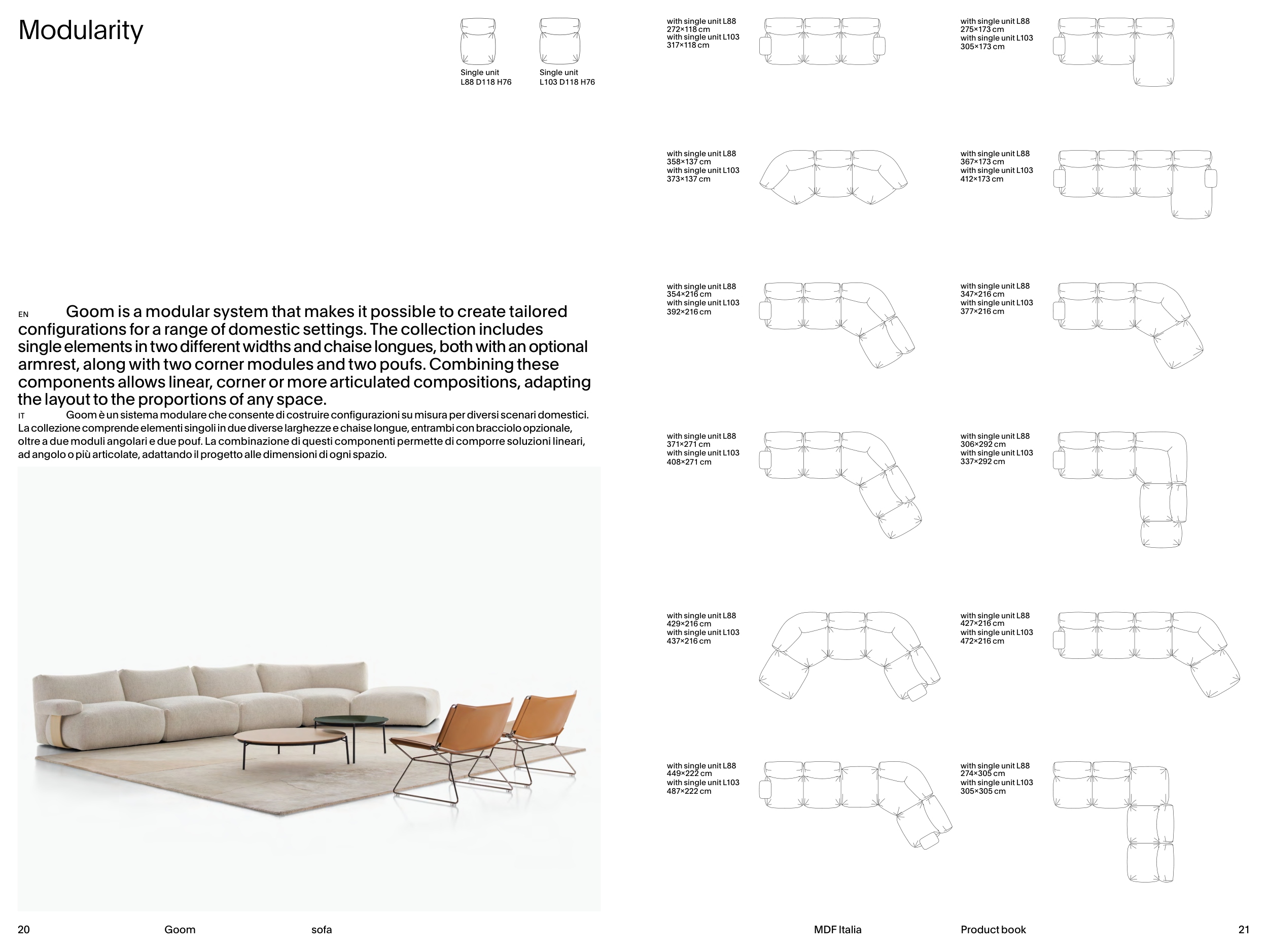 oltre a due moduli angolari e due pouf. La combinazione di questi componenti permette di comporre soluzioni lineari,