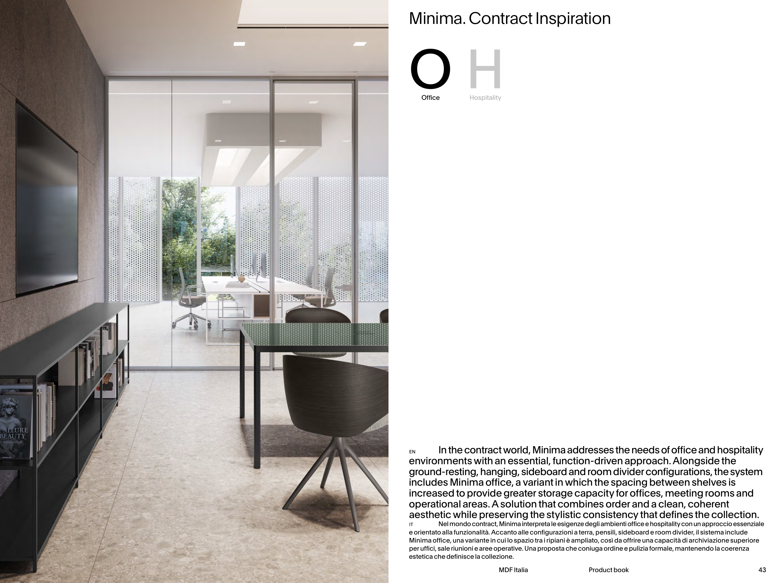 Nel mondo contract, Minima interpreta le esigenze degli ambienti office e hospitality con un approccio essenziale