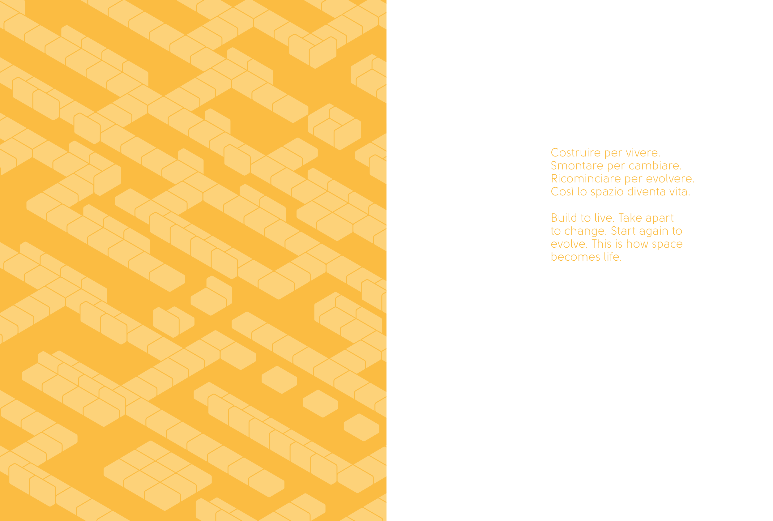 Costruire per vivere. Smontare per cambiare. Ricominciare per evolvere. Così lo spazio diventa vita. Build to live. Take apart to change. Start again to evolve. This is how space becomes life.