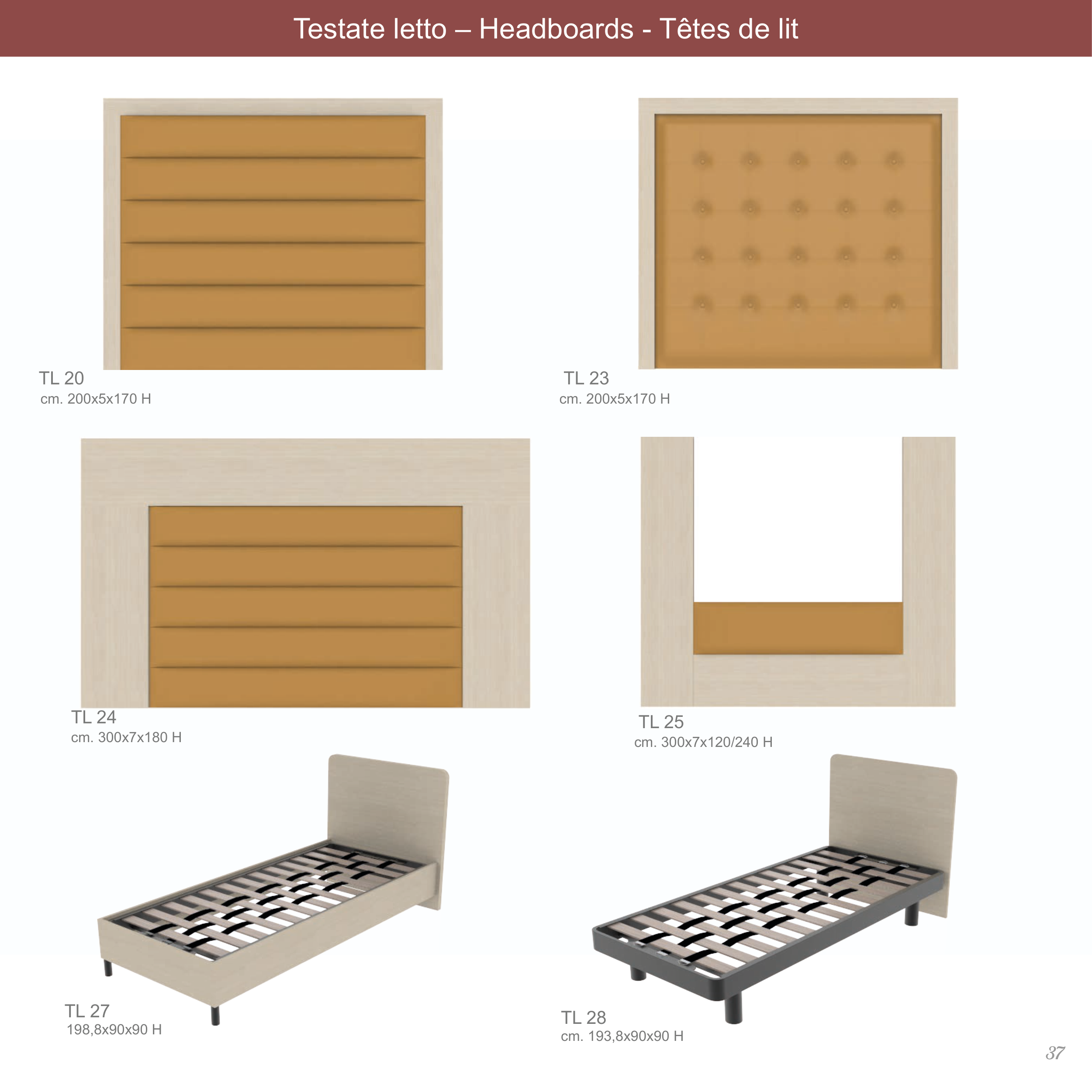 Testate letto – Headboards - Têtes de lit TL 28 TL 27 TL 25 TL 24 TL 23 TL 20 cm. 200x5x170 H cm. 300x7x180 H 198,8x90x90 H cm. 193,8x90x90 H cm. 200x5x170 H cm. 300x7x120/240 H 37