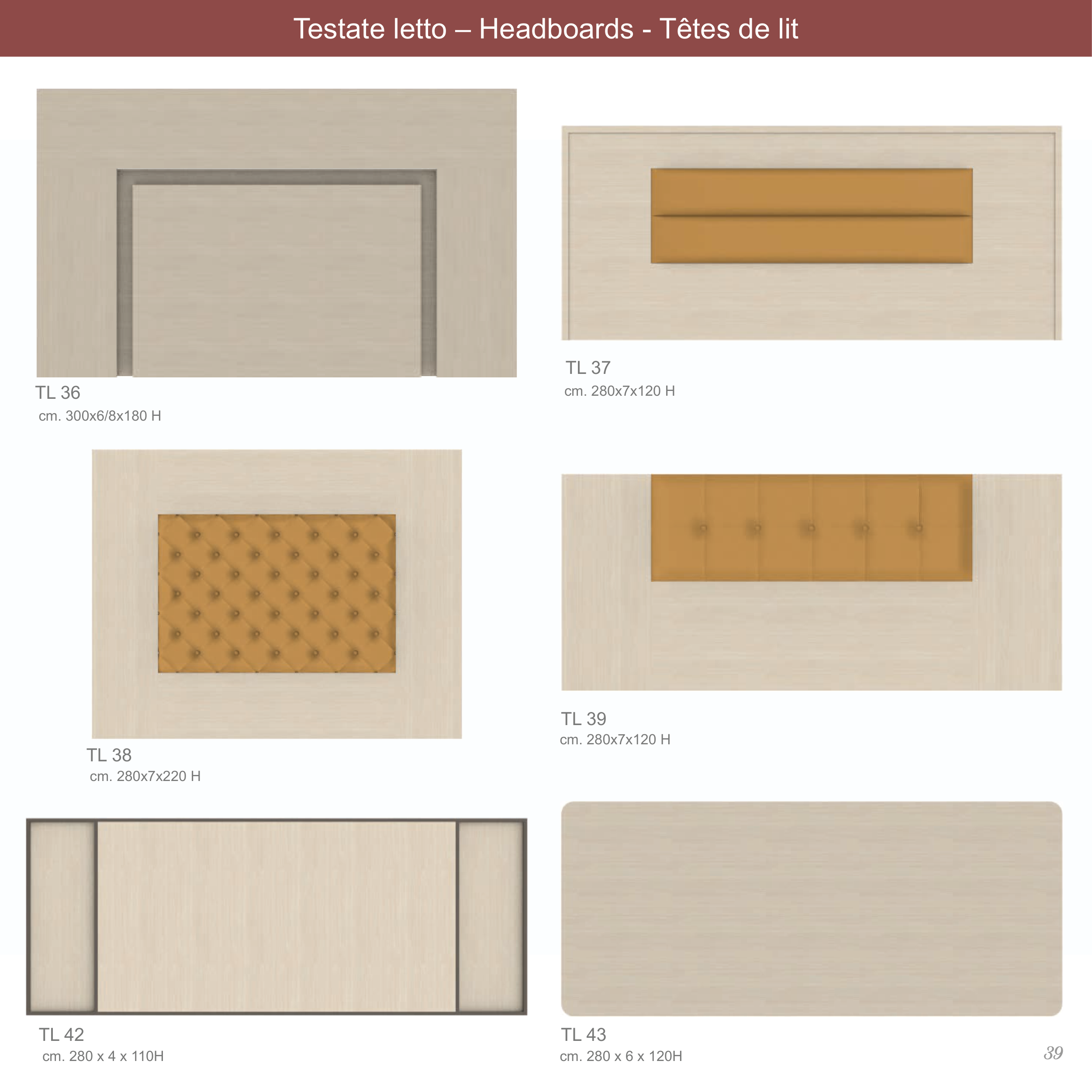 Testate letto – Headboards - Têtes de lit TL 43 TL 42 TL 39 TL 38 TL 37 TL 36 cm. 300x6/8x180 H cm. 280x7x220 H cm. 280 x 4 x 110H cm. 280x7x120 H cm. 280x7x120 H cm. 280 x 6 x 120H 39