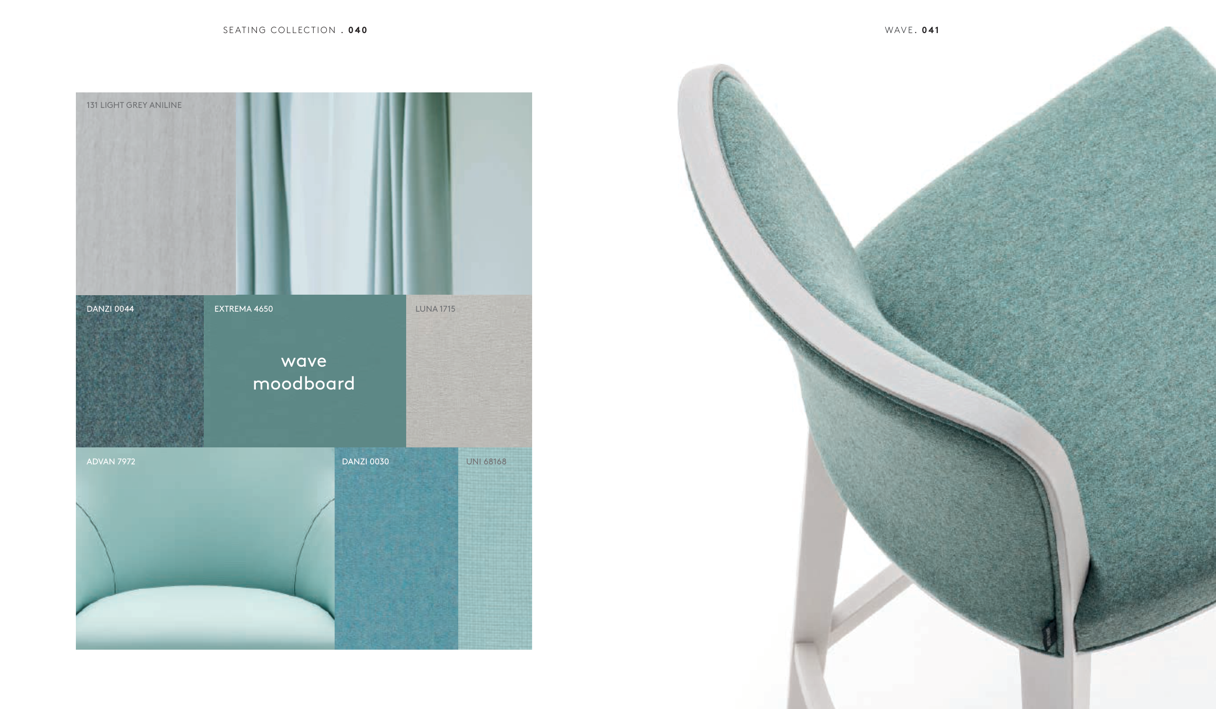 DANZI 0044 DANZI 0030 EXTREMA 4650 LUNA 1715 ADVAN 7972 131 LIGHT GREY ANILINE wave moodboard UNI 68168 SE AT I N G C O L L EC T I O N . 0 4 0 WAV E . 0 41
