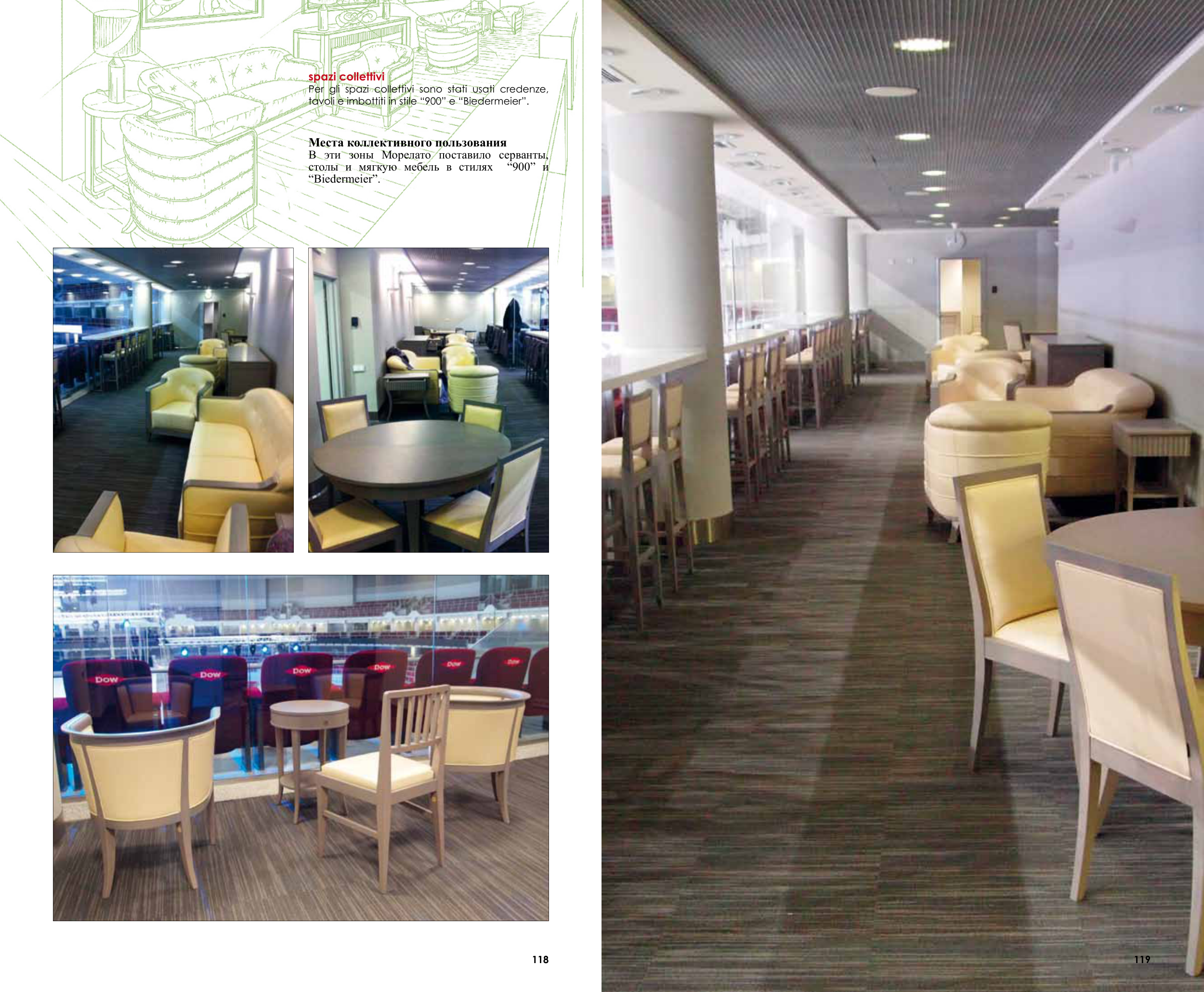 118 119 spazi collettivi Per gli spazi collettivi sono stati usati credenze, tavoli e imbottiti in stile “900” e “Biedermeier”. Места коллективного пользования в эти зоны Морелато поставило серванты, столы и мягкую мебель в стилях “900” и “Biedermeier”.