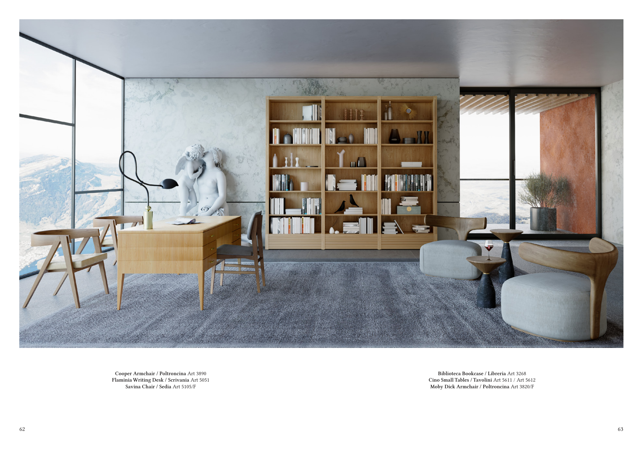 63 62 Cooper Armchair / Poltroncina Art 3890 Flaminia Writing Desk / Scrivania Art 5051 Savina Chair / Sedia Art 5105/F Biblioteca Bookcase / Libreria Art 3268 Cino Small Tables / Tavolini Art 5611 / Art 5612 Moby Dick Armchair / Poltroncina Art 3820/F