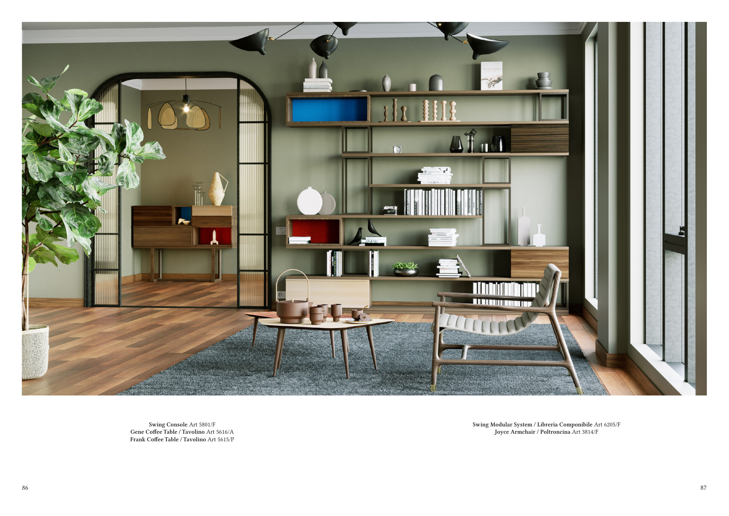 87 86 Swing Console Art 5801/F Gene Coffee Table / Tavolino Art 5616/A Frank Coffee Table / Tavolino Art 5615/P Swing Modular System / Libreria Componibile Art 6205/F Joyce Armchair / Poltroncina Art 3814/F