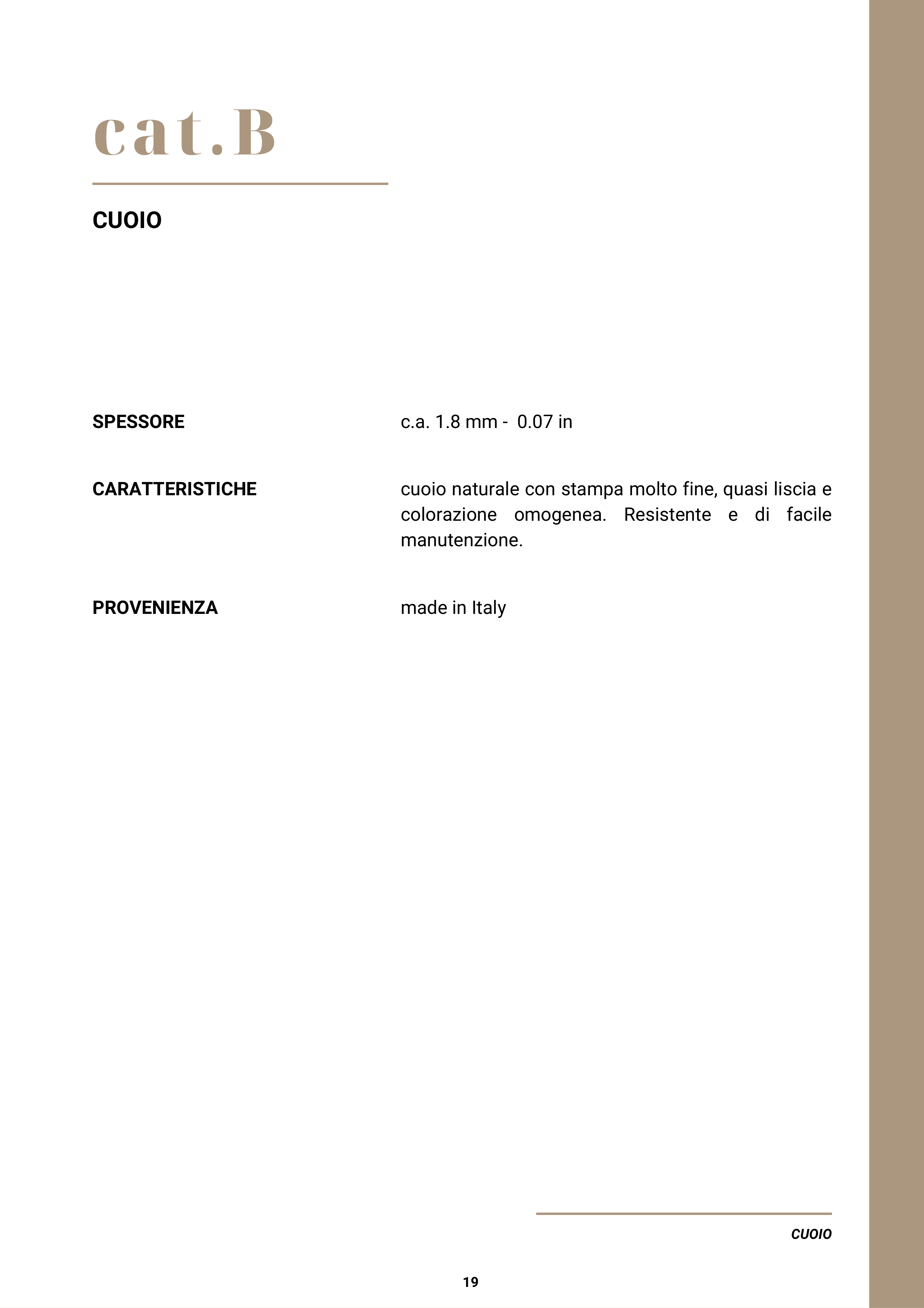 cat.B CUOIO c.a. 1.8 mm - 0.07 in cuoio naturale con stampa molto fine, quasi liscia e colorazione omogenea. Resistente e di facile manutenzione. CARATTERISTICHE SPESSORE PROVENIENZA made in Italy CUOIO 19
