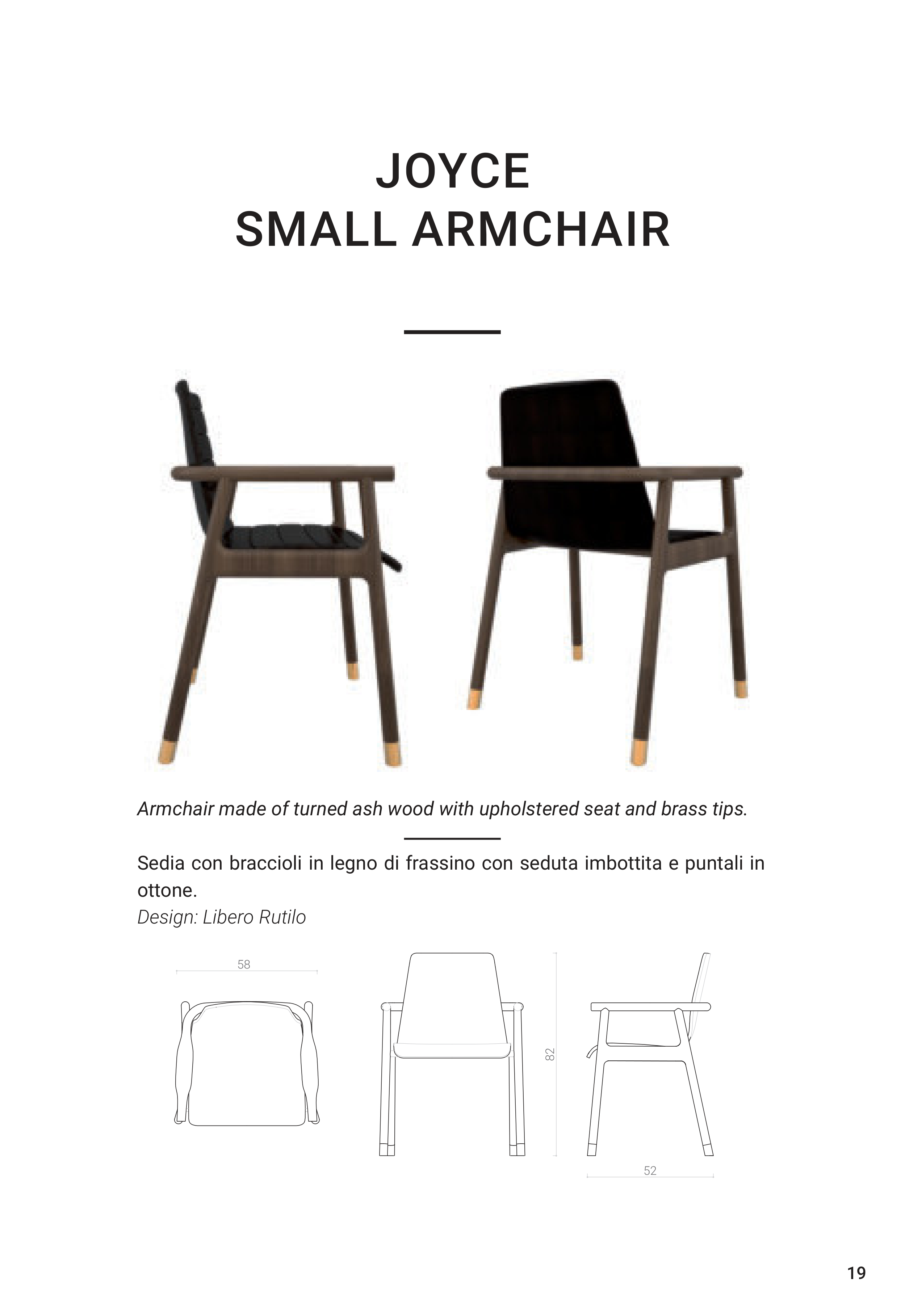 19 JOYCE SMALL ARMCHAIR Armchair made of turned ash wood with upholstered seat and brass tips. Sedia con braccioli in legno di frassino con seduta imbottita e puntali in ottone. Design: Libero Rutilo