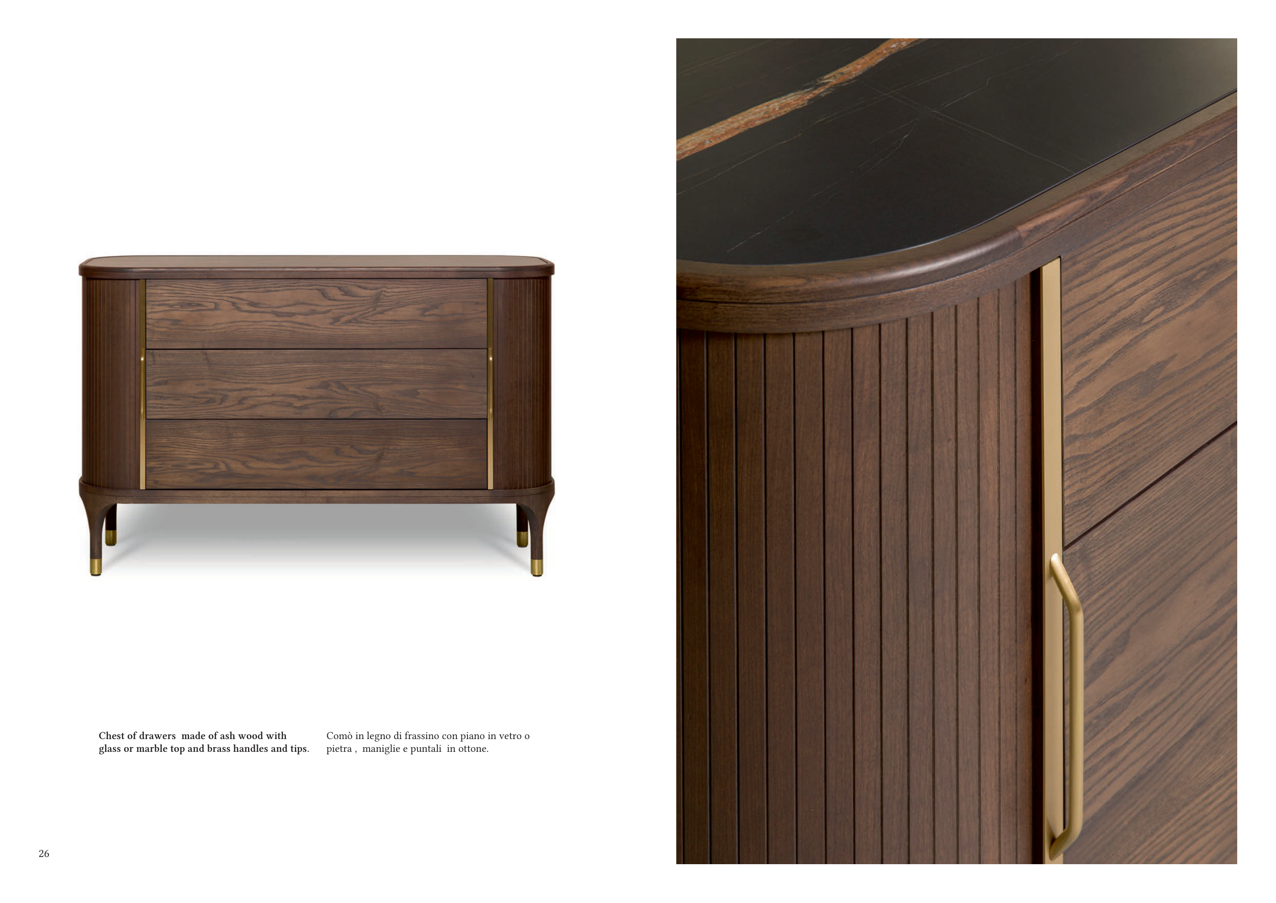 26 Chest of drawers made of ash wood with glass or marble top and brass handles and tips. Comò in legno di frassino con piano in vetro o pietra , maniglie e puntali in ottone. 27