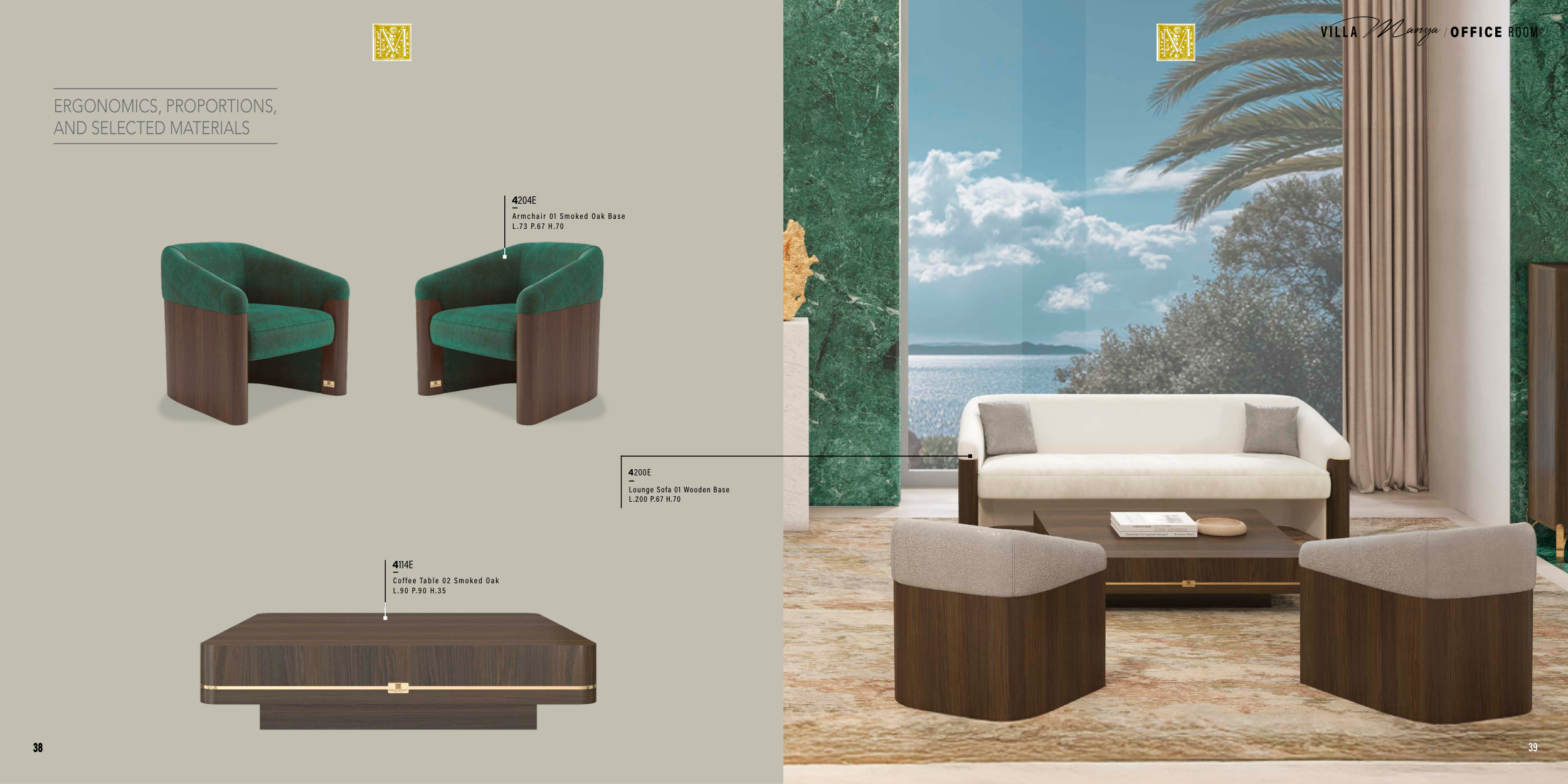 4204E Armchair 01 Smoked Oak Base L . 73 P.67 H. 70 ERGONOMICS, PROPORTIONS, AND SELECTED MATERIALS 4114E Coffee Table 02 Smoked Oak L .90 P.90 H.35 4200E Lounge Sofa 01 Wooden Base L.200 P.67 H.70 V I L L A Manya / OFFICE ROOM 39 38 39 38
