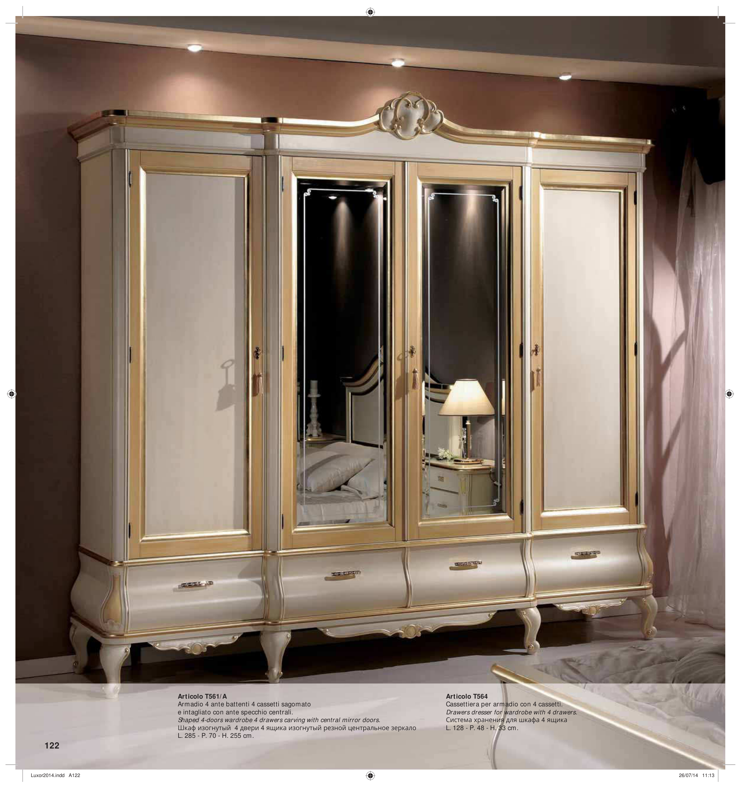 Shaped 4-doors wardrobe 4 drawers carving with central mirror doors.