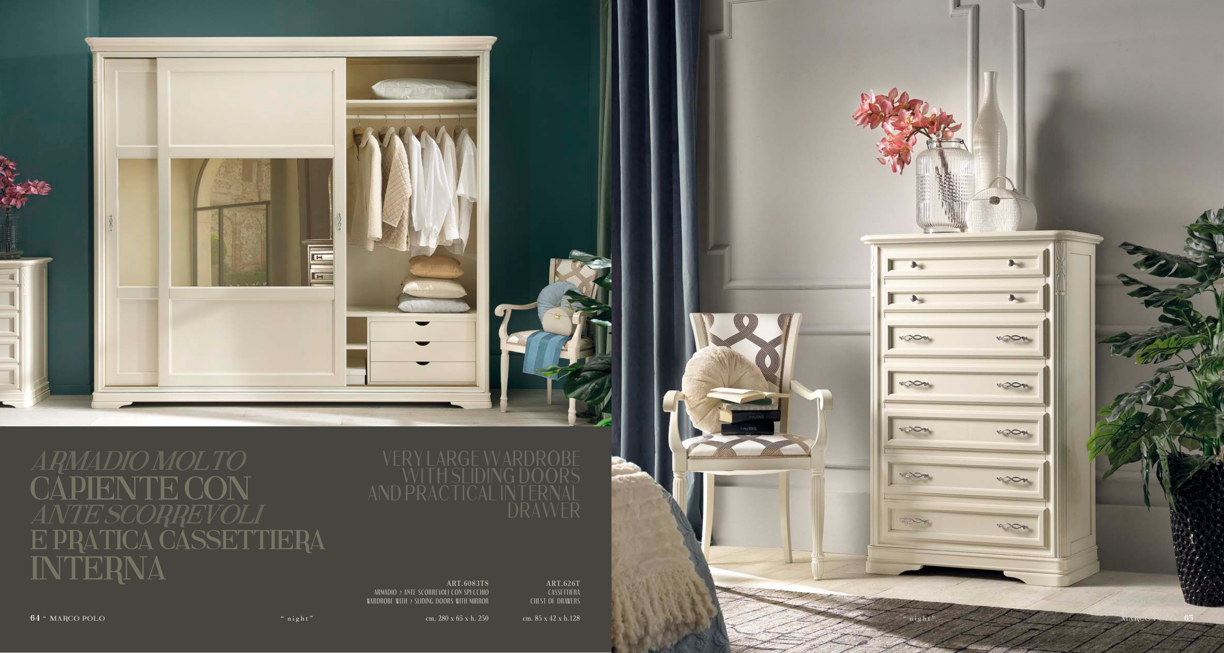 64 “ marco polo “ n i g h t ” Art.6083tS ARMADIO 2 ANTE SCORREVOLI CON SpECCHIO wARDRObE wITH 2 SLIDINg DOORS wITH MIRROR cm. 280 x 65 x h. 250 Art.626t CASSETTIERA CHEST OF DRAwERS cm. 85 x 42 x h.128 marco polo " 65 “ n i g h t ”