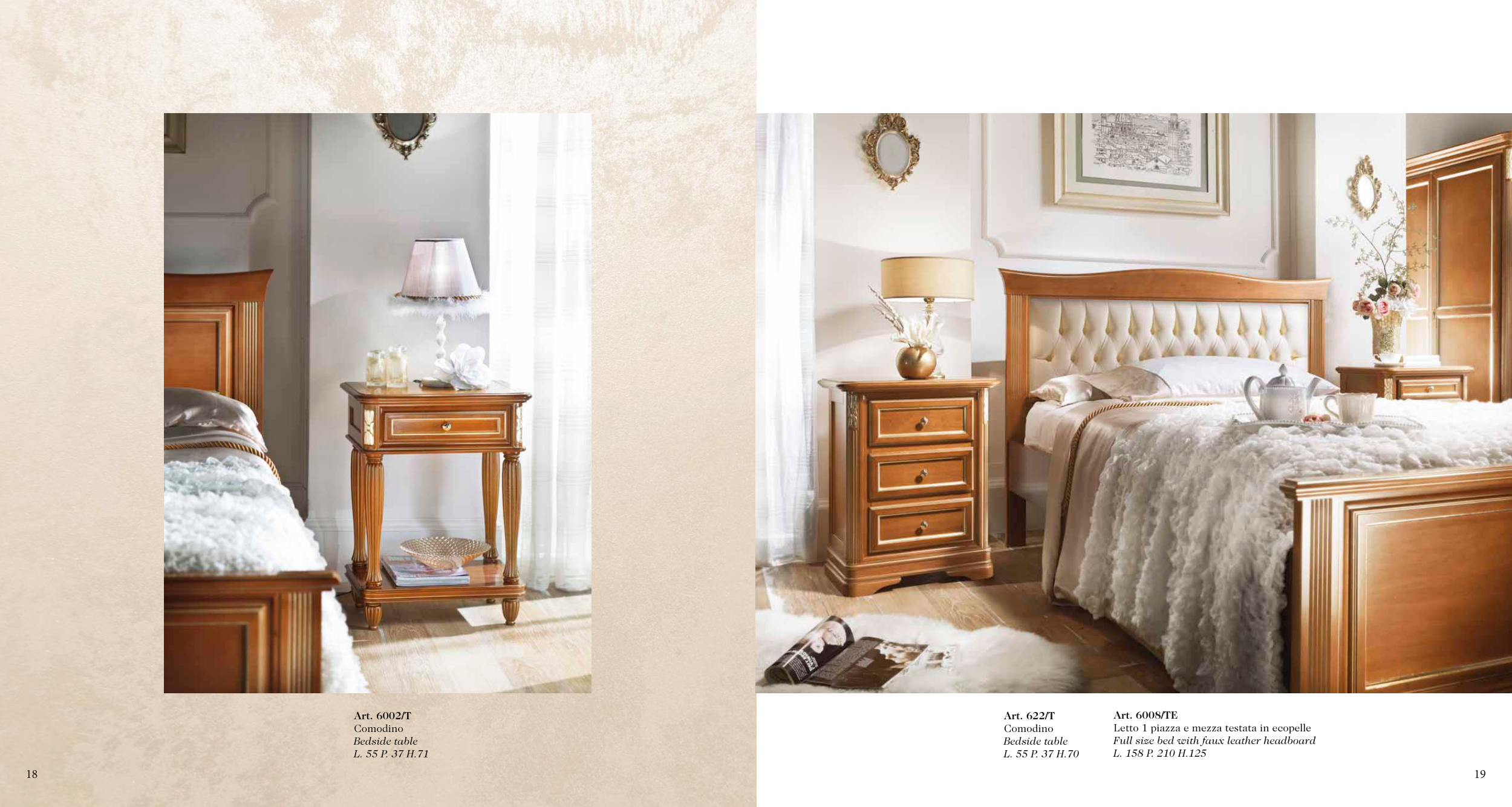 Art. 6002/T Comodino Bedside table L. 55 P. 37 H.71 Art. 622/T Comodino Bedside table L. 55 P. 37 H.70 Art. 6008/TE Letto 1 piazza e mezza testata in ecopelle Full size bed with faux leather headboard L. 158 P. 210 H.125 18 19