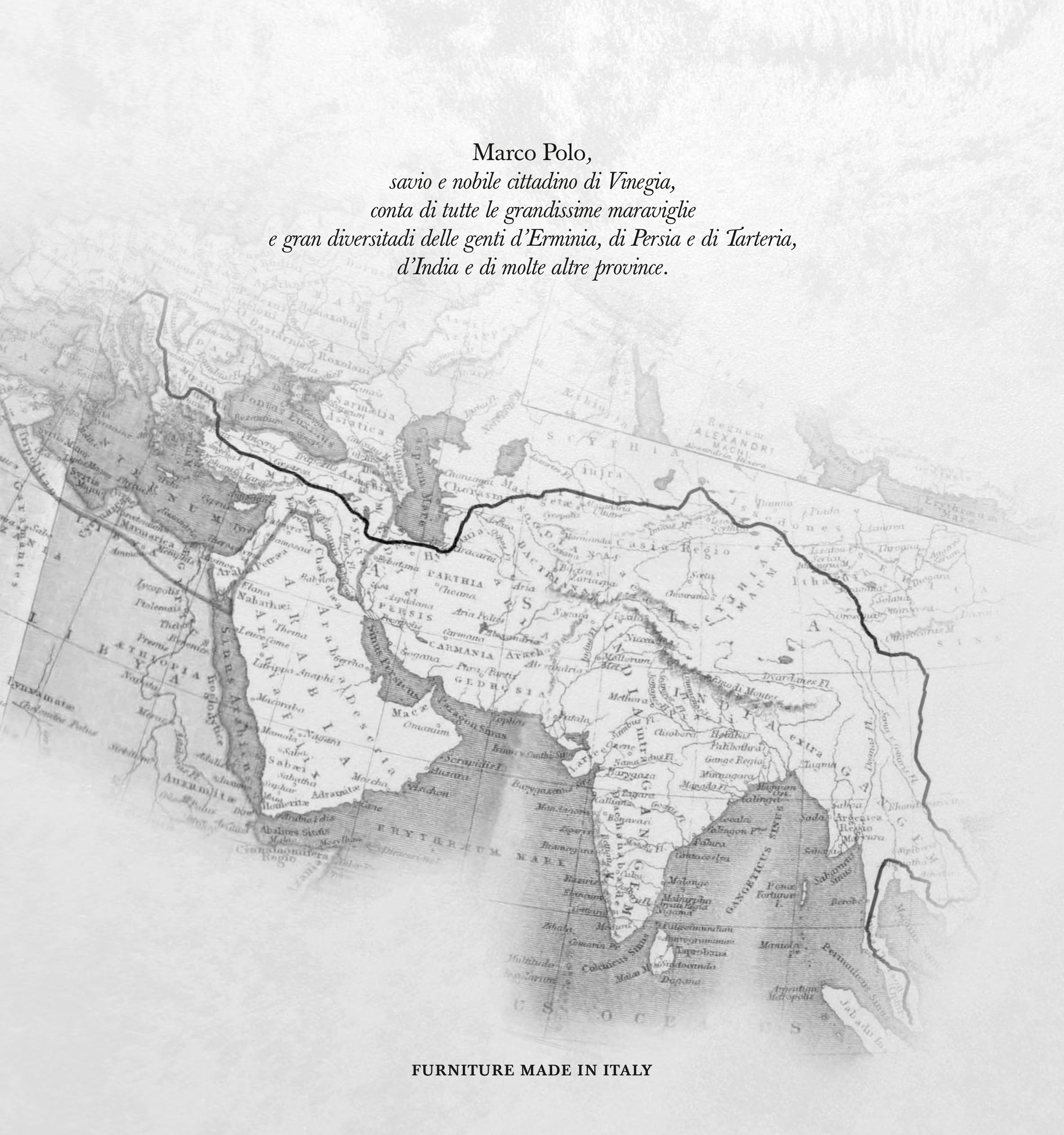 Marco Polo, savio e nobile cittadino di Vinegia, conta di tutte le grandissime maraviglie e gran diversitadi delle genti d’Erminia, di Persia e di Tarteria, d’India e di molte altre province. FURNITURE MADE IN ITALY