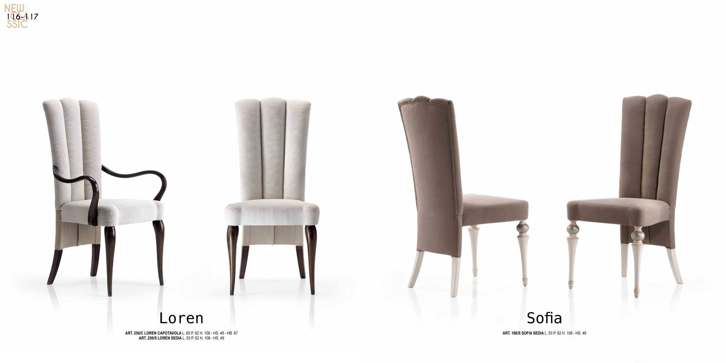 Loren Sofia ART. 256/C LOREN CAPOTAVOLA L. 65 P. 62 H. 108 - HS. 49 - HB. 67 ART. 256/S LOREN SEDIA L. 53 P. 62 H. 108 - HS. 49 ART. 186/S SOFIA SEDIA L. 53 P. 62 H. 108 - HS. 49 NEW CLA SSIC 116-117