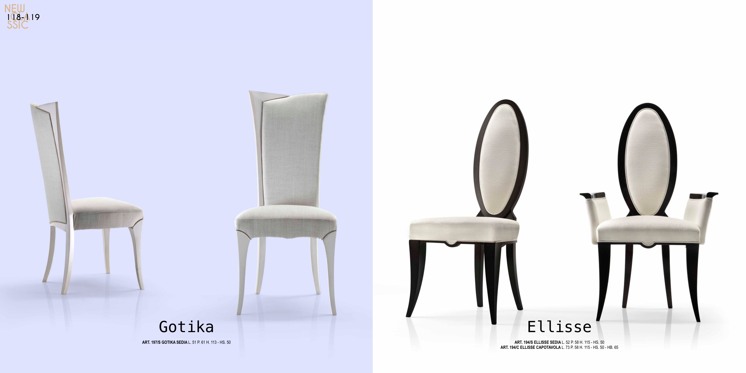 Gotika Ellisse ART. 197/S GOTIKA SEDIA L. 51 P. 61 H. 113 - HS. 50 ART. 194/S ELLISSE SEDIA L. 52 P. 58 H. 115 - HS. 50 ART. 194/C ELLISSE CAPOTAVOLA L. 73 P. 58 H. 115 - HS. 50 - HB. 65 NEW CLA SSIC 118-119