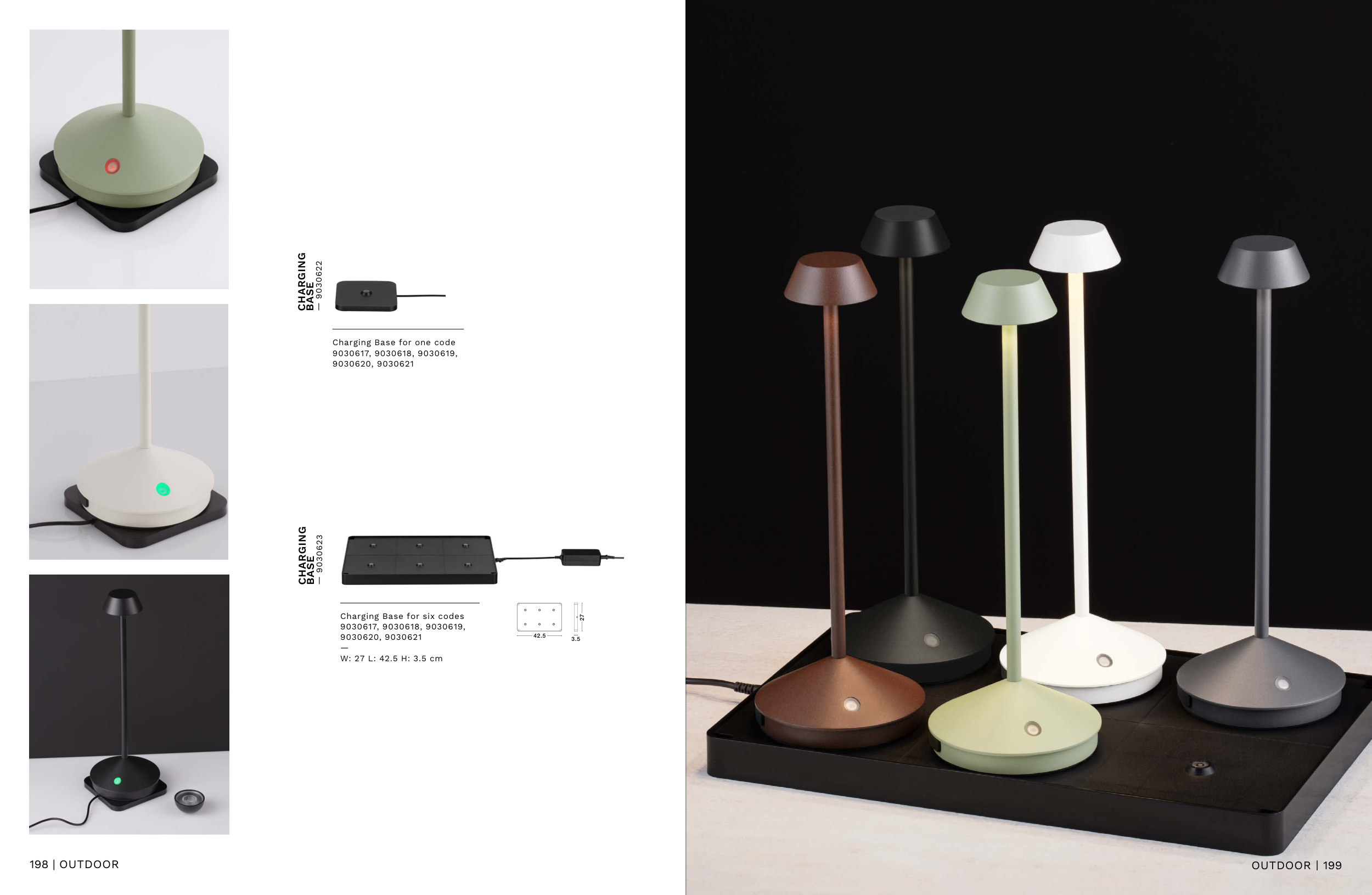 Charging Base for one code 9030617, 9030618, 9030619, 9030620, 9030621 CHARGING BASE — 9030622 CHARGING BASE — 9030623 Charging Base for six codes 9030617, 9030618, 9030619, 9030620, 9030621 — W: 27 L: 42.5 H: 3.5 cm 27 42.5 3.5 198 | OUTDOOR OUTDOOR | 199