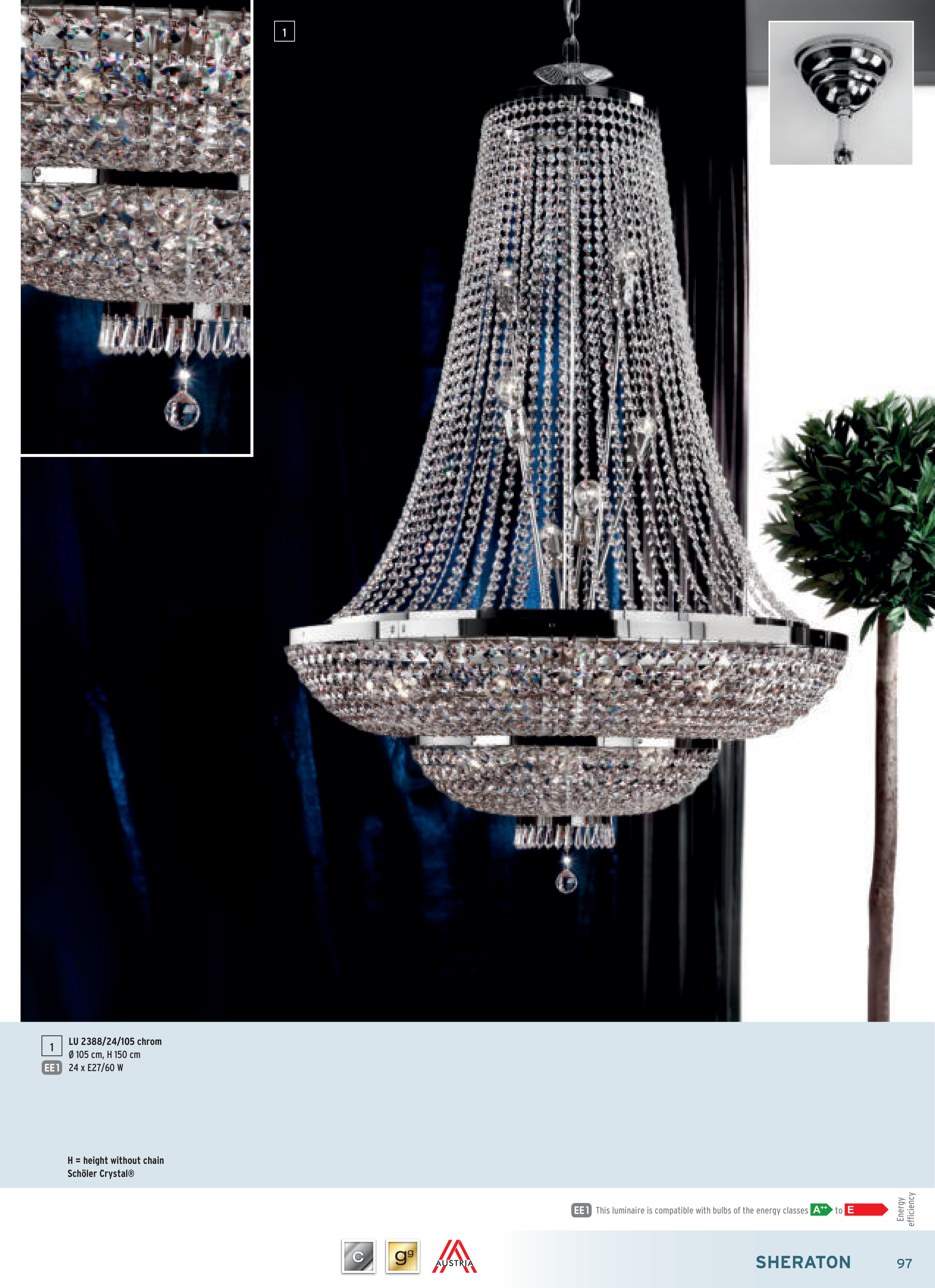 1 Energy efficiency This luminaire is compatible with bulbs of the energy classes to EE1 97 SHERATON EE1 LU 2388/24/105 chrom Ø 105 cm, H 150 cm 24 x E27/60 W H = height without chain Schöler Crystal® 1