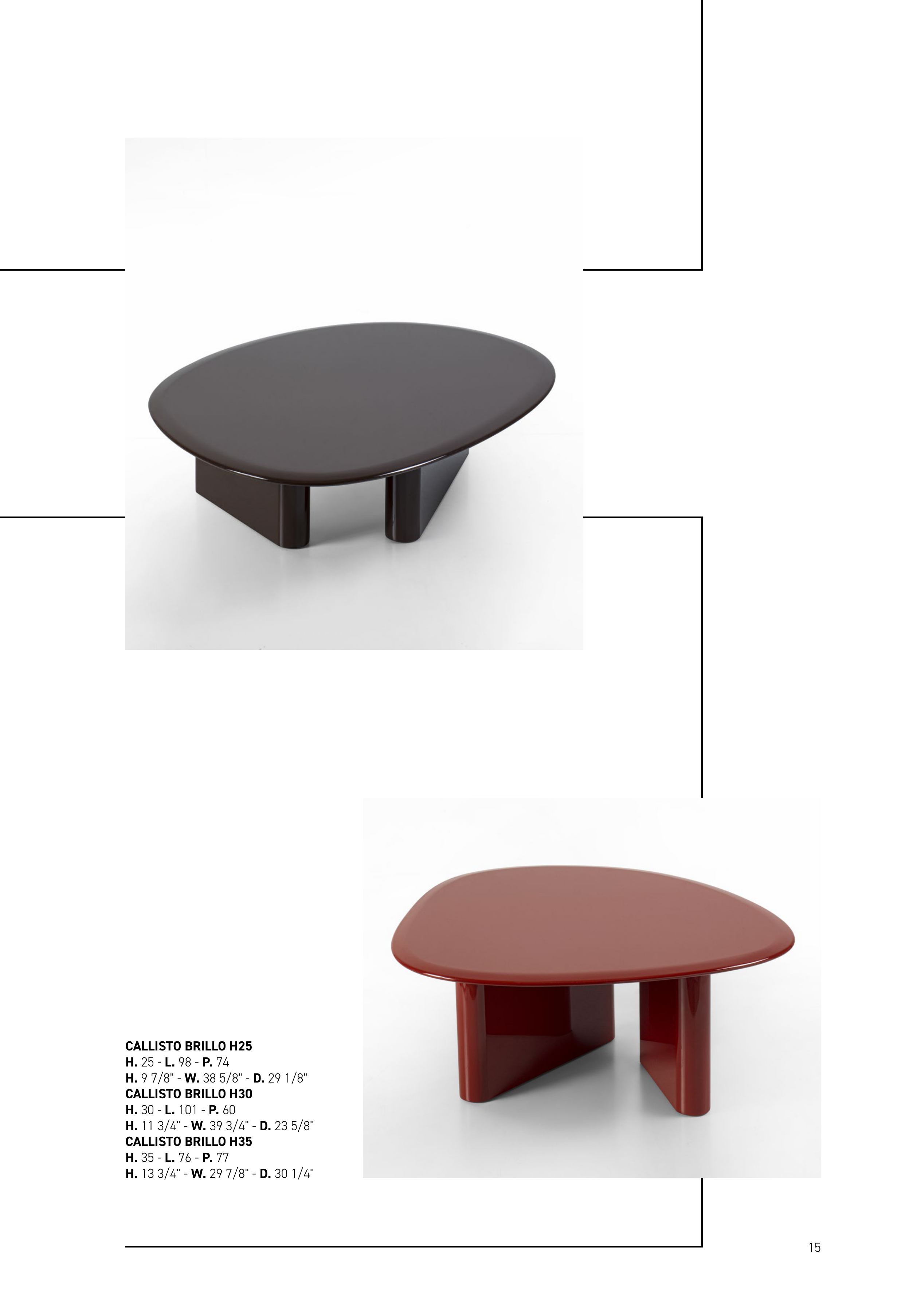 15 CALLISTO BRILLO H25 H. 25 - L. 98 - P. 74 H. 9 7/8" - W. 38 5/8" - D. 29 1/8" CALLISTO BRILLO H30 H. 30 - L. 101 - P. 60 H. 11 3/4" - W. 39 3/4" - D. 23 5/8" CALLISTO BRILLO H35 H. 35 - L. 76 - P. 77 H. 13 3/4" - W. 29 7/8" - D. 30 1/4"