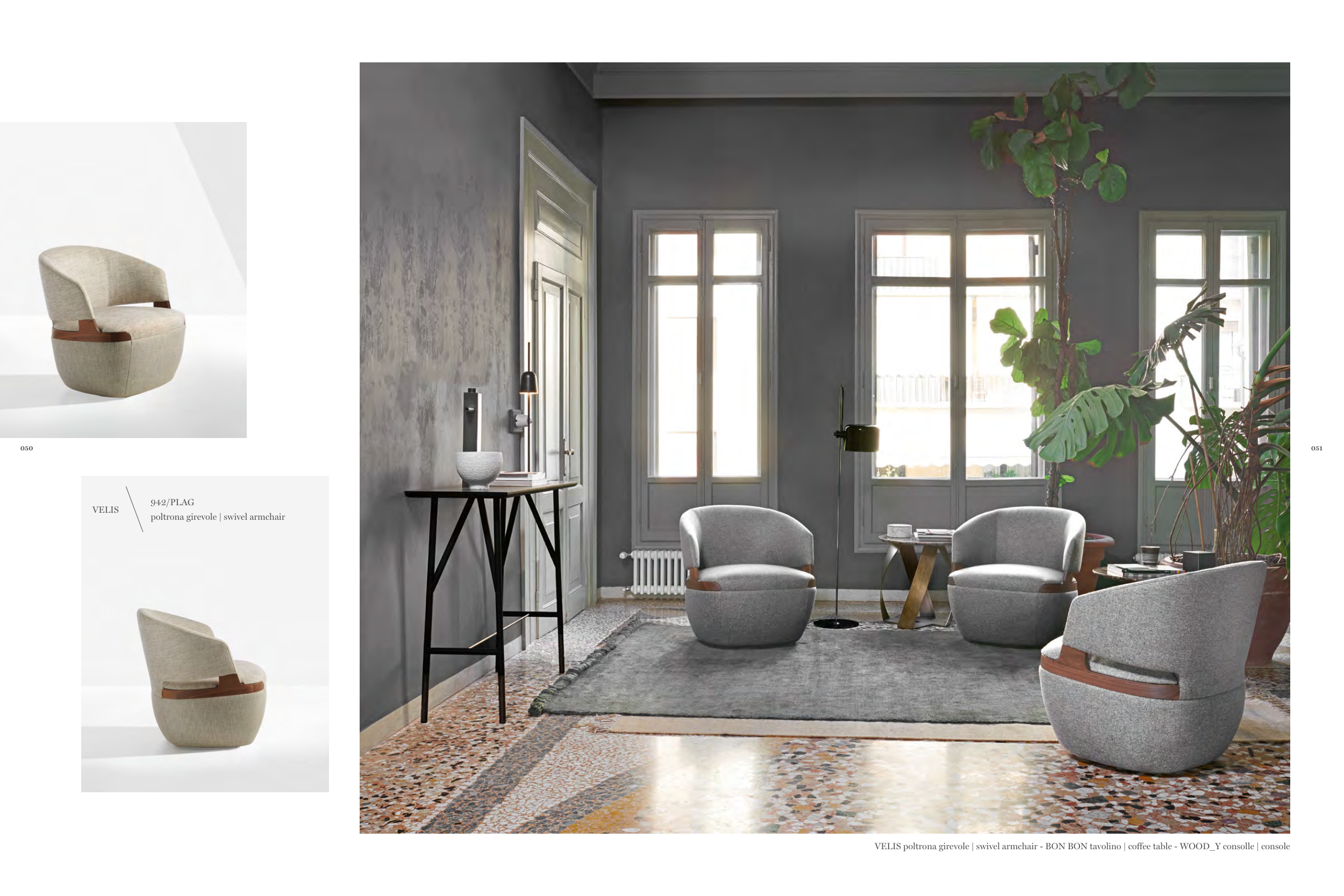 VELIS poltrona girevole | swivel armchair - BON BON tavolino | coffee table - WOOD_Y consolle | console