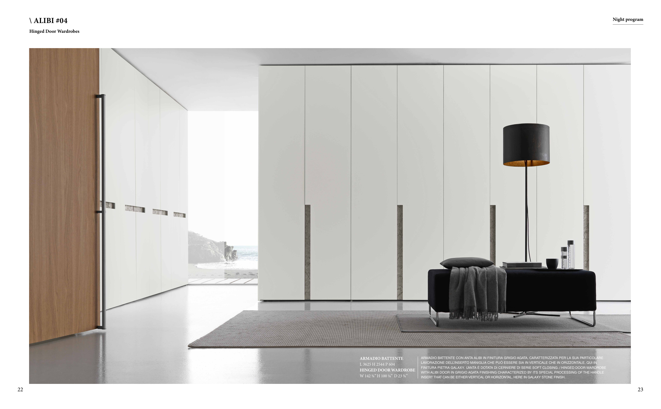 FINITURA PIETRA GALAXY. L’ANTA È DOTATA DI CERNIERE DI SERIE SOFT CLOSING. / HINGED DOOR WARDROBE