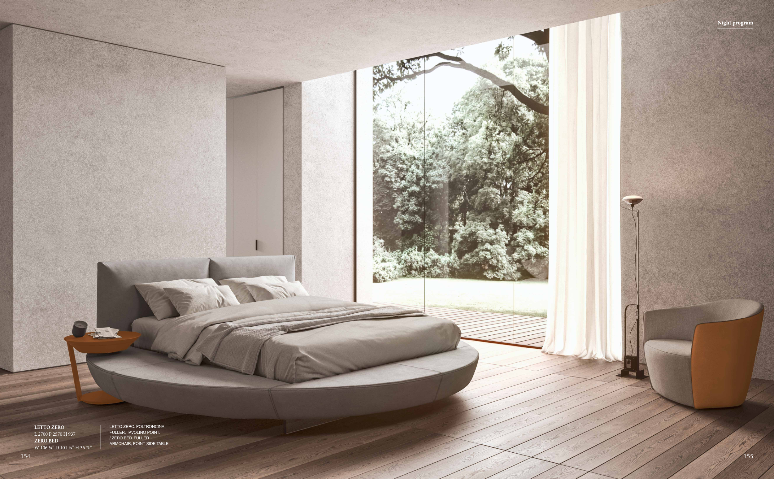 \ ZERO #43 Beds 154 LETTO ZERO L 2700 P 2570 H 937 ZERO BED W 106 ¼” D 101 1/8” H 36 7/8” LETTO ZERO. POLTRONCINA FULLER, TAVOLINO POINT. / ZERO BED. FULLER ARMCHAIR, POINT SIDE TABLE. 155 Night program