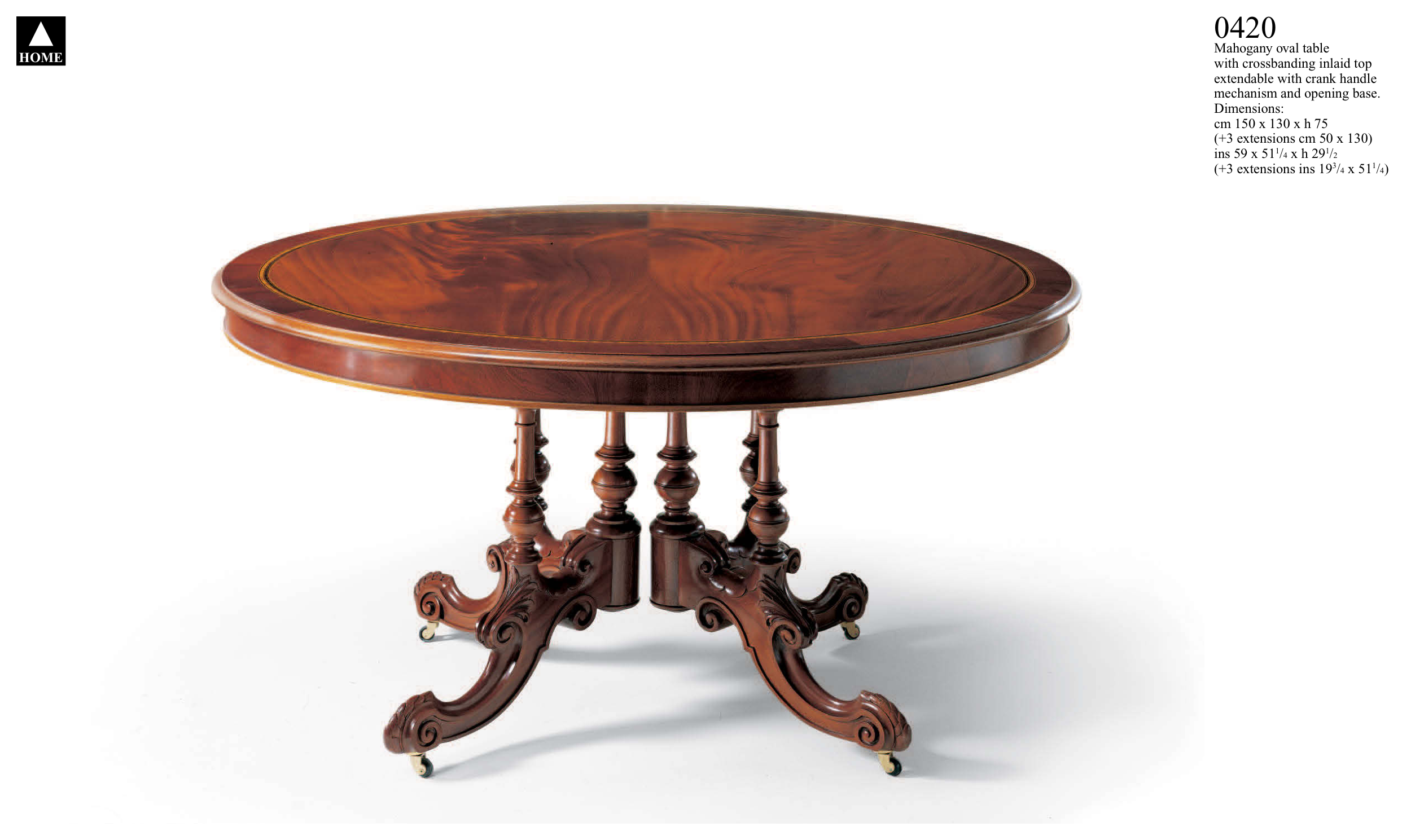 HOME 0420 Mahogany oval table with crossbanding inlaid top extendable with crank handle mechanism and opening base. Dimensions: cm 150 x 130 x h 75 (+3 extensions cm 50 x 130) ins 59 x 511/4 x h 291/2 (+3 extensions ins 193/4 x 511/4)