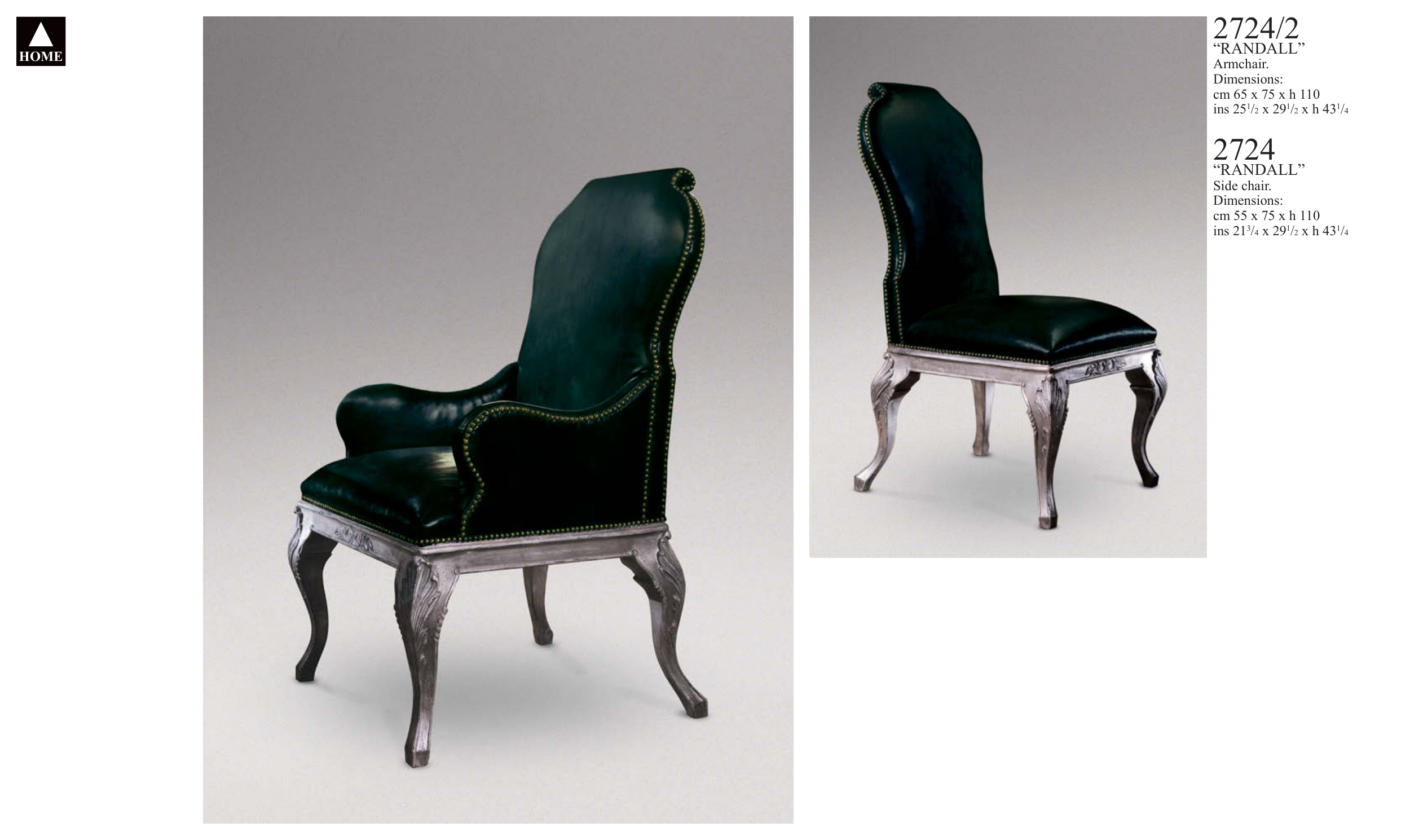 HOME 2724/2 “RANDALL” Armchair. Dimensions: cm 65 x 75 x h 110 ins 251/2 x 291/2 x h 431/4 2724 “RANDALL” Side chair. Dimensions: cm 55 x 75 x h 110 ins 213/4 x 291/2 x h 431/4