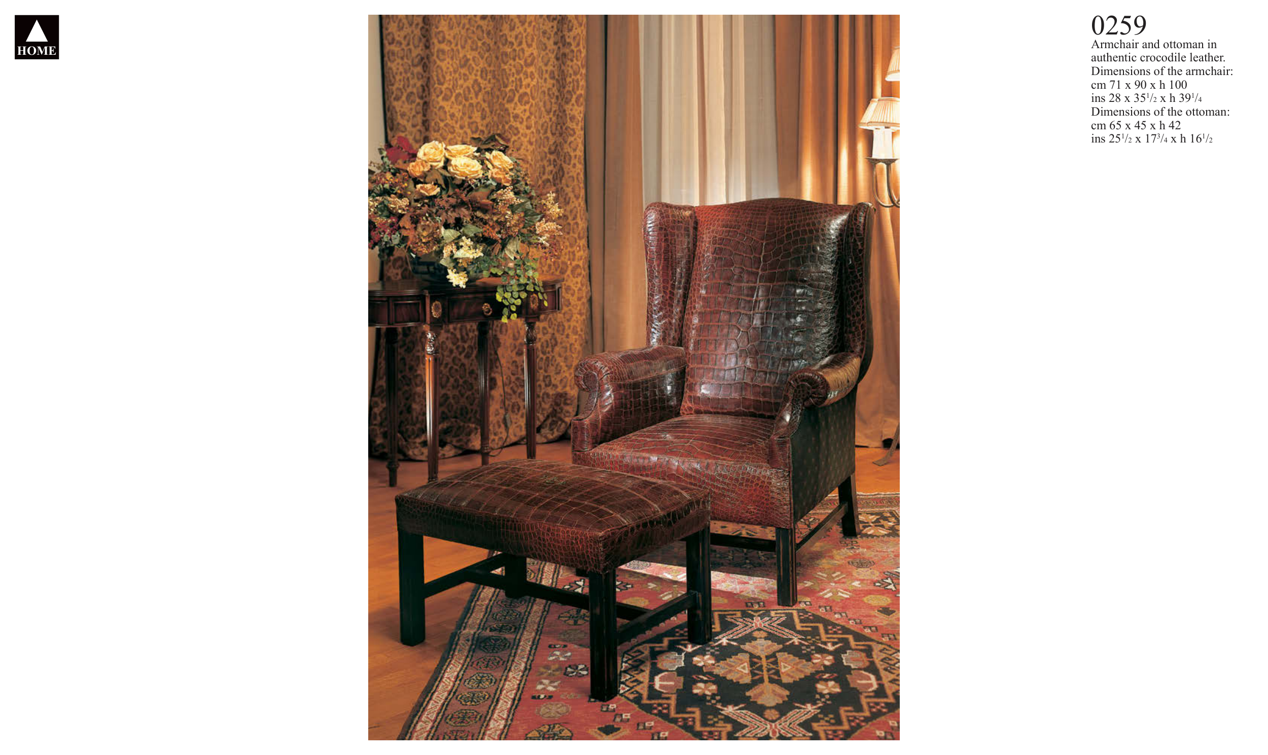 HOME 0259 Armchair and ottoman in authentic crocodile leather. Dimensions of the armchair: cm 71 x 90 x h 100 ins 28 x 351/2 x h 391/4 Dimensions of the ottoman: cm 65 x 45 x h 42 ins 251/2 x 173/4 x h 161/2