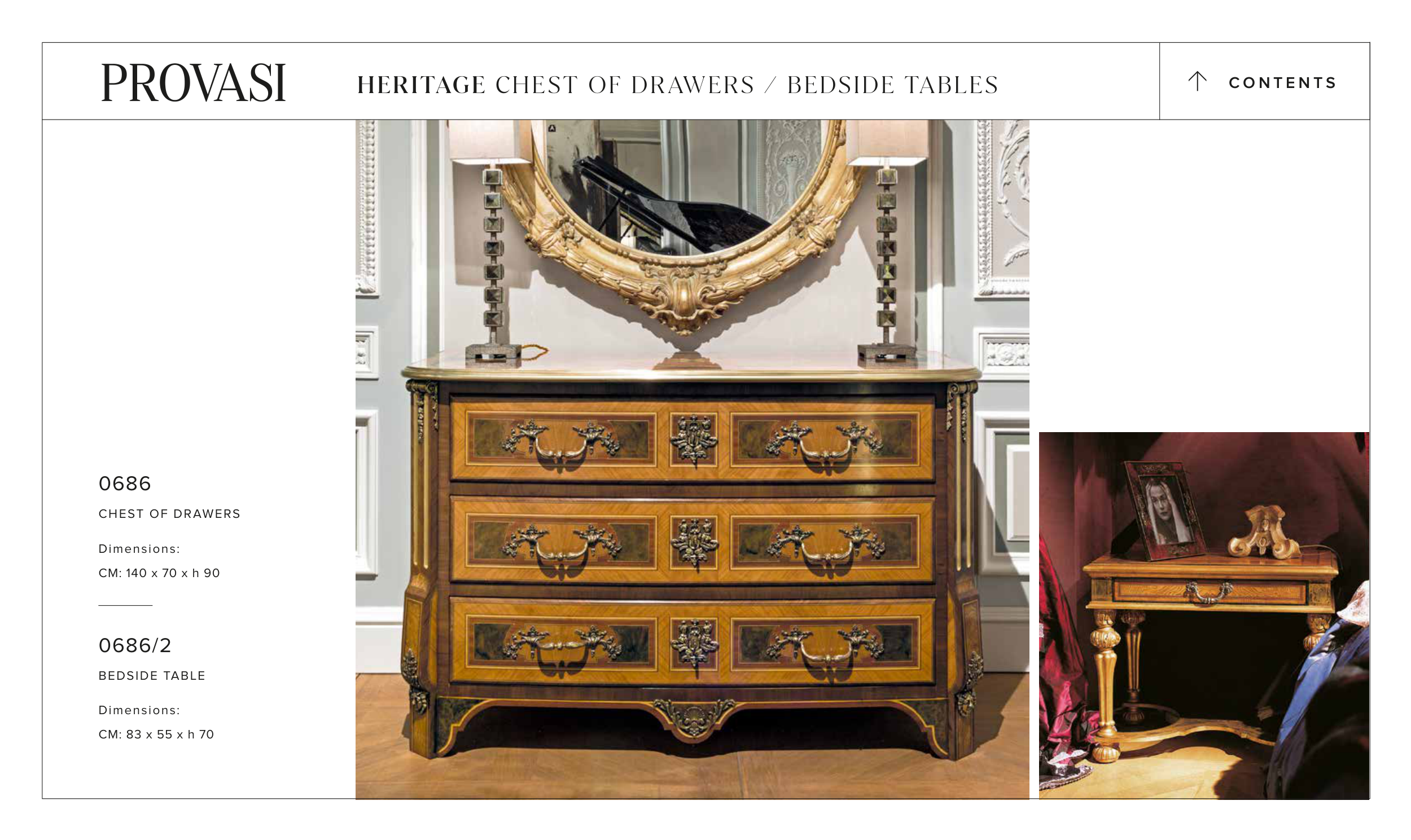 0686 CHEST OF DRAWERS Dimensions: CM: 140 x 70 x h 90 0686/2 BEDSIDE TABLE Dimensions: CM: 83 x 55 x h 70 C O N T E N T S > HERITAGE CHEST OF DRAWERS / BEDSIDE TABLES