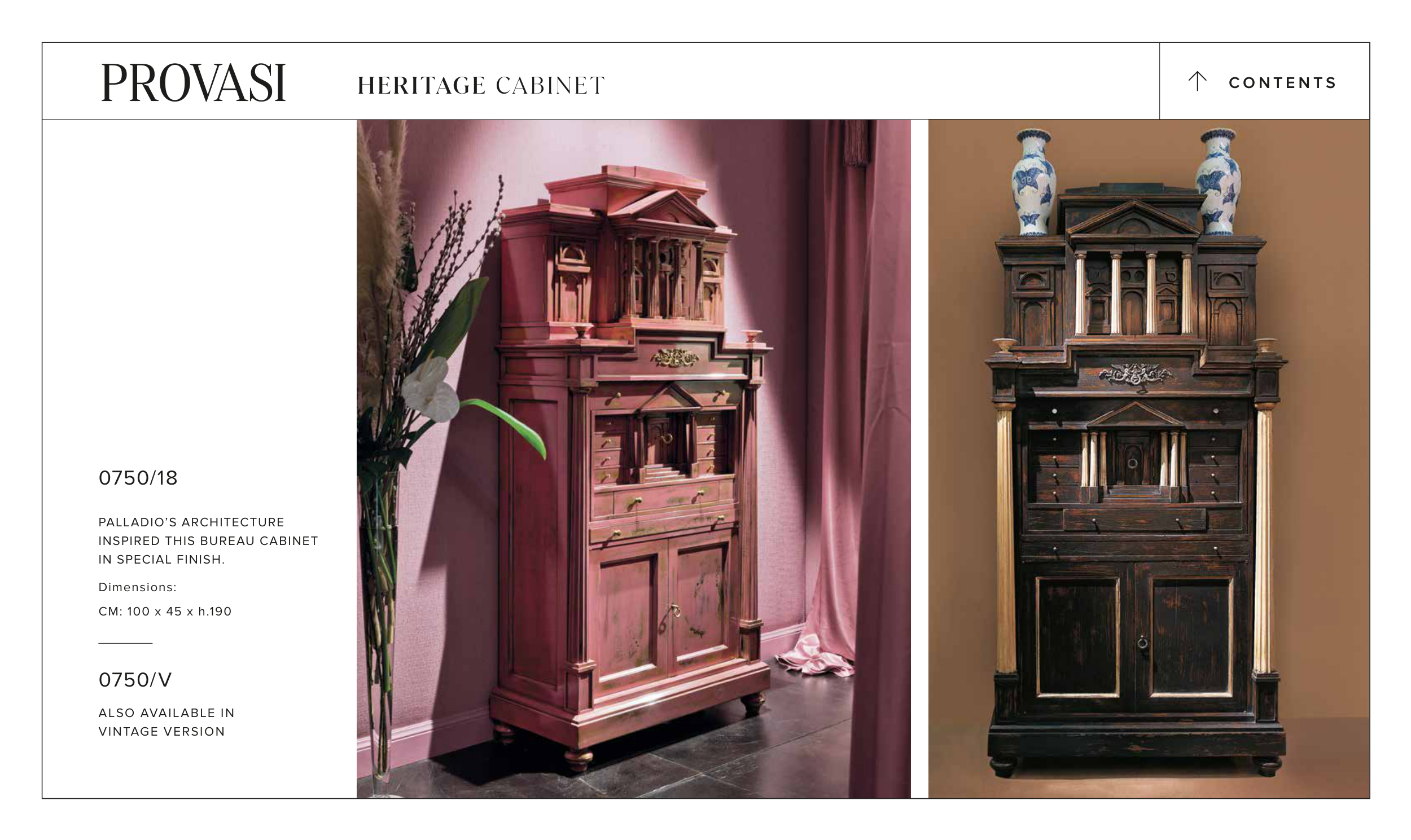 0750/18 PALLADIO’S ARCHITECTURE INSPIRED THIS BUREAU CABINET IN SPECIAL FINISH. Dimensions: CM: 100 x 45 x h.190 0750/V ALSO AVAILABLE IN VINTAGE VERSION C O N T E N T S > HERITAGE CABINET