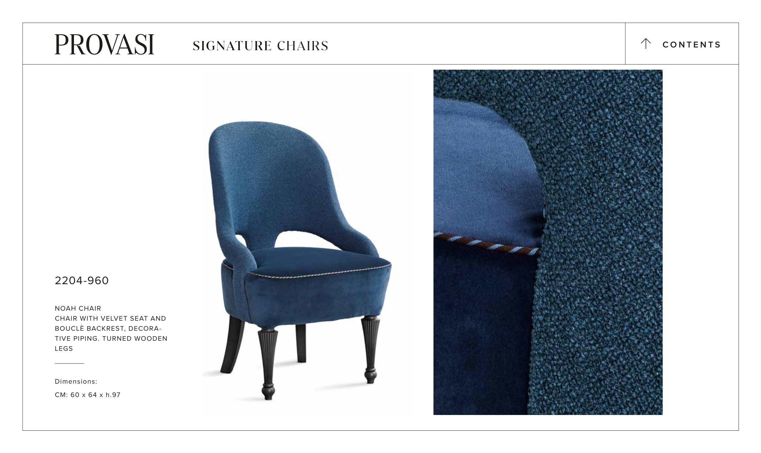 2204-960 NOAH CHAIR CHAIR WITH VELVET SEAT AND BOUCLÈ BACKREST, DECORA- TIVE PIPING. TURNED WOODEN LEGS Dimensions: CM: 60 x 64 x h.97 C O N T E N T S > SIGNATURE CHAIRS