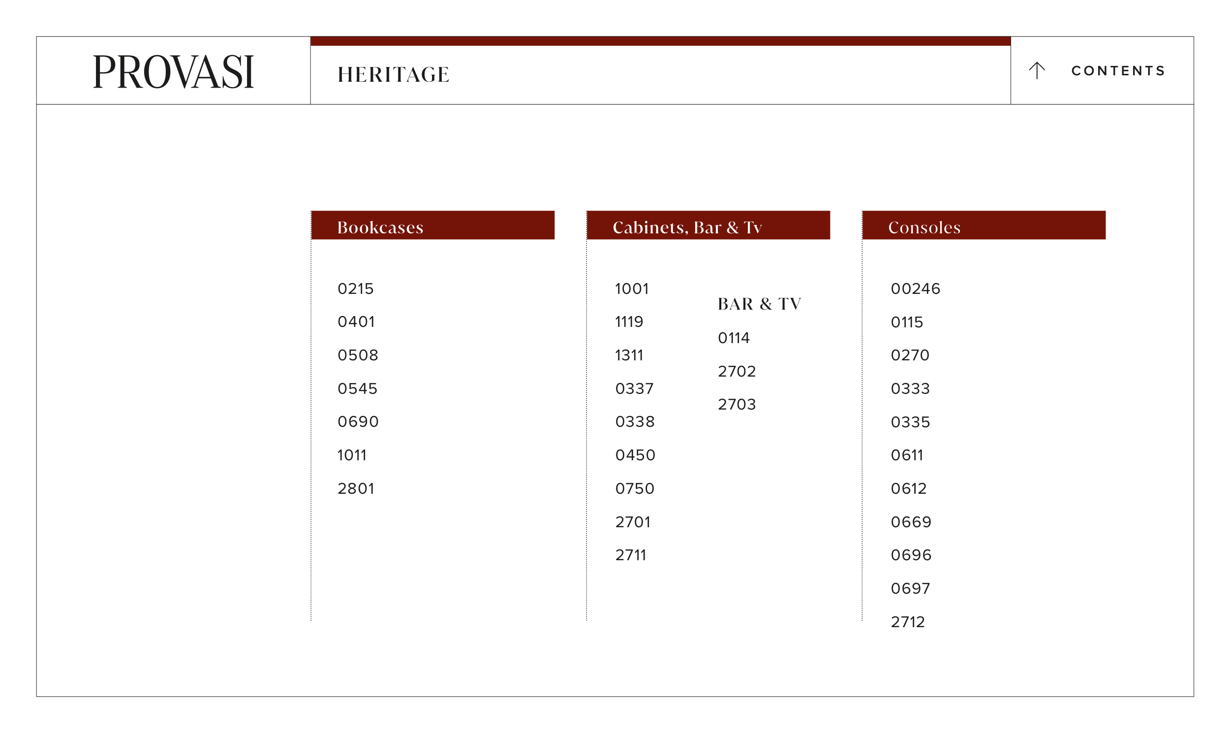 C O N T E N T S > HERITAGE Bookcases Cabinets, Bar & Tv Consoles 0215 0401 0508 0545 0690 1011 2801 1001 1119 1311 0337 0338 0450 0750 2701 2711 00246 0115 0270 0333 0335 0611 0612 0669 0696 0697 2712 BAR & TV 0114 2702 2703