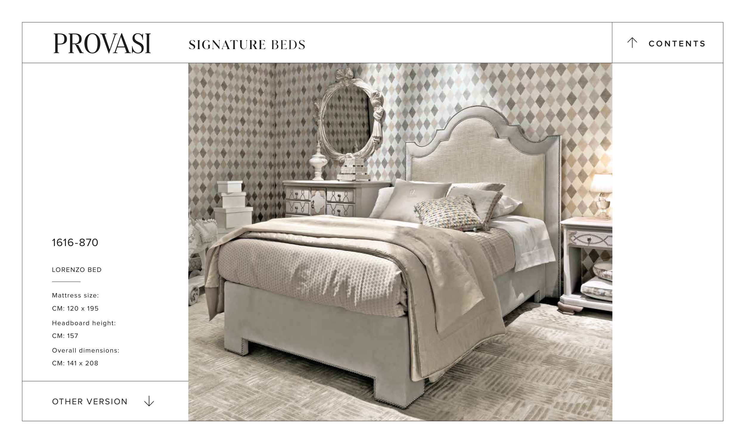 1616-870 LORENZO BED Mattress size: CM: 120 x 195 Headboard height: CM: 157 Overall dimensions: CM: 141 x 208 OTHER VERSION > C O N T E N T S > SIGNATURE BEDS