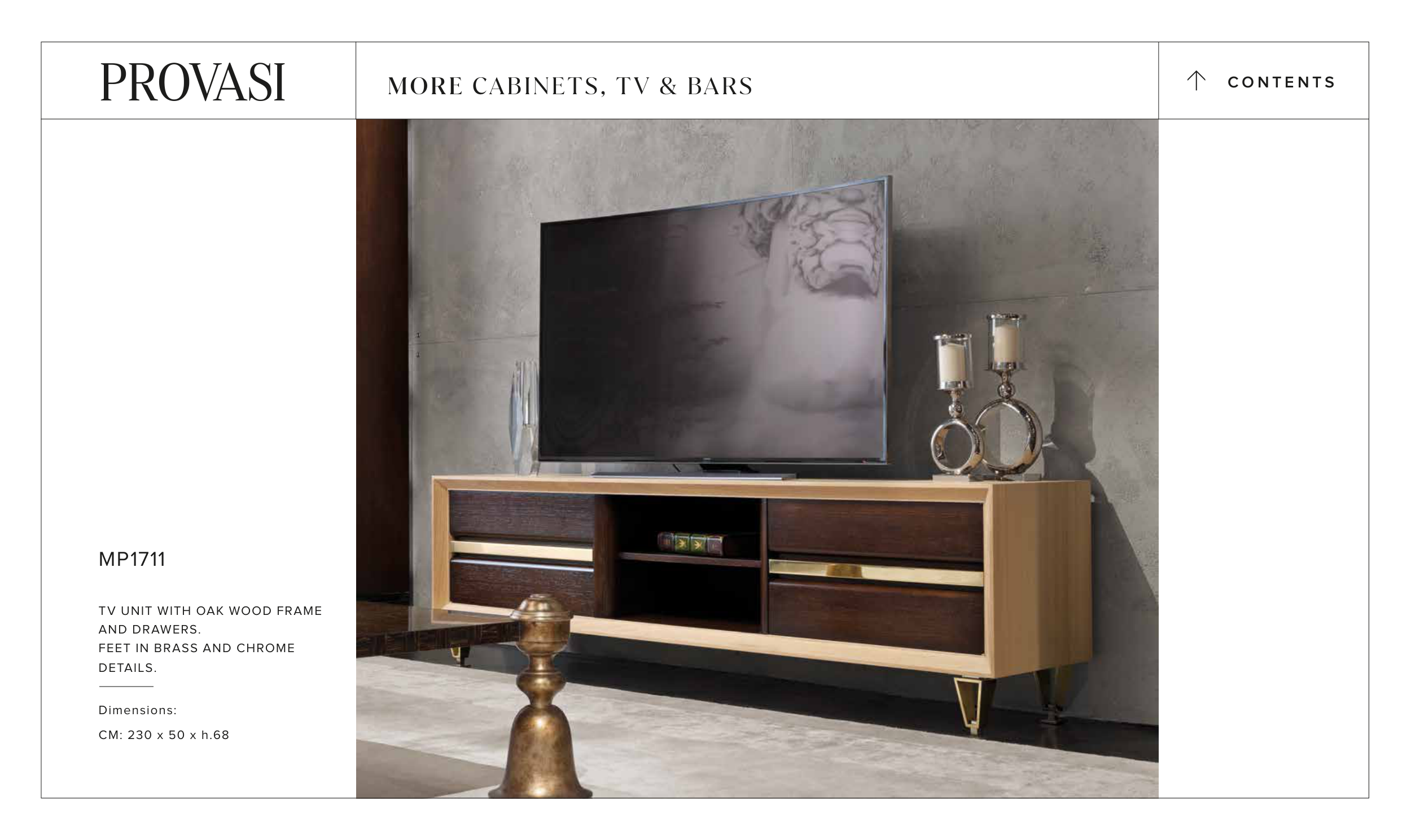 MP1711 TV UNIT WITH OAK WOOD FRAME AND DRAWERS. FEET IN BRASS AND CHROME DETAILS. Dimensions: CM: 230 x 50 x h.68 C O N T E N T S > MORE CABINETS, TV & BARS