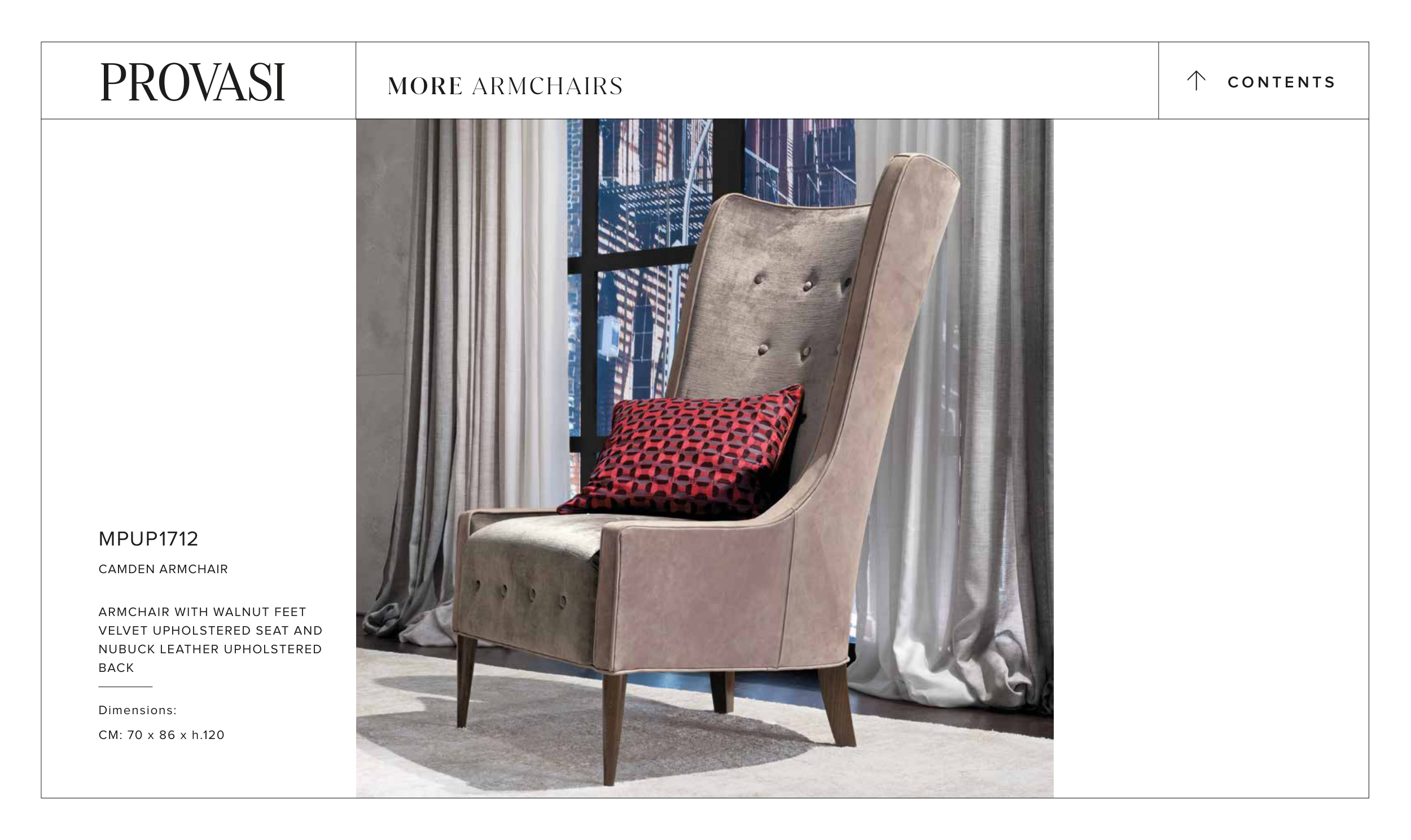 MPUP1712 CAMDEN ARMCHAIR ARMCHAIR WITH WALNUT FEET VELVET UPHOLSTERED SEAT AND NUBUCK LEATHER UPHOLSTERED BACK Dimensions: CM: 70 x 86 x h.120 C O N T E N T S > MORE ARMCHAIRS