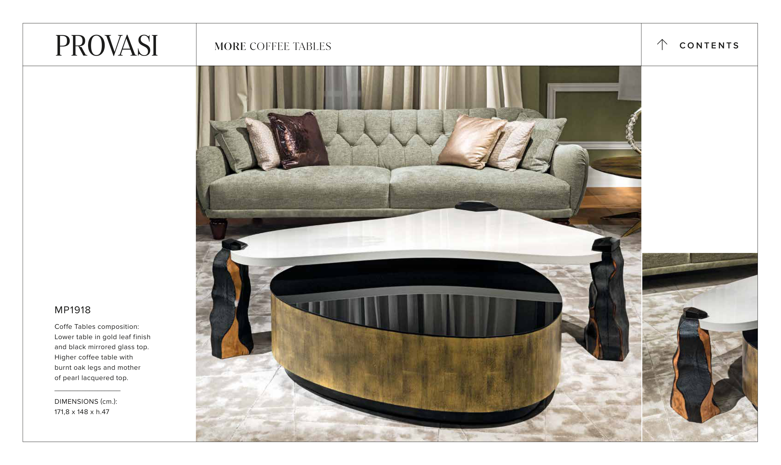 MP1918 Coffe Tables composition: Lower table in gold leaf finish and black mirrored glass top. Higher coffee table with burnt oak legs and mother of pearl lacquered top. _________________ DIMENSIONS (cm.): 171,8 x 148 x h.47 C O N T E N T S > MORE COFFEE TABLES