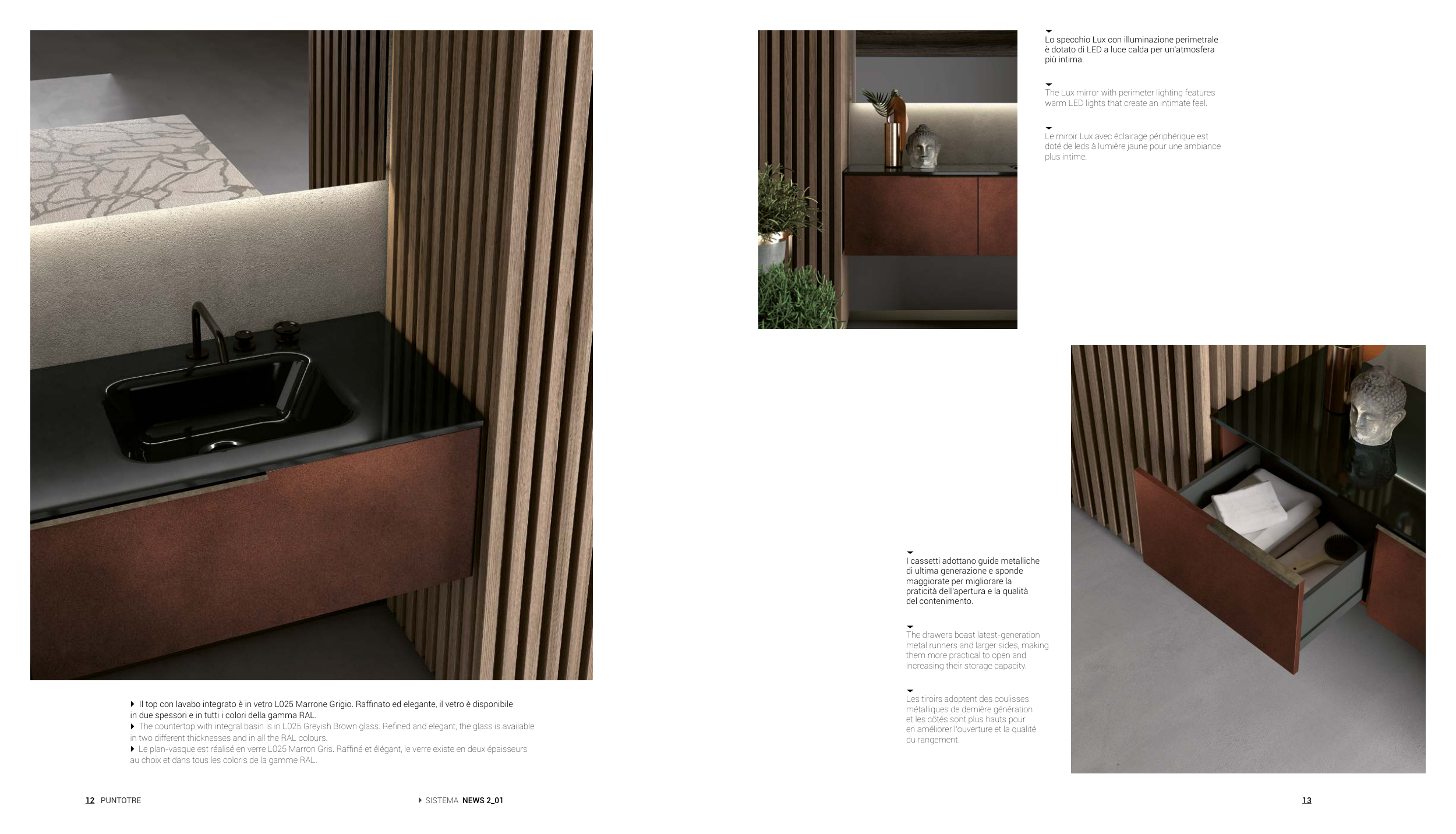 The countertop with integral basin is in L025 Greyish Brown glass. Refined and elegant, the glass is available