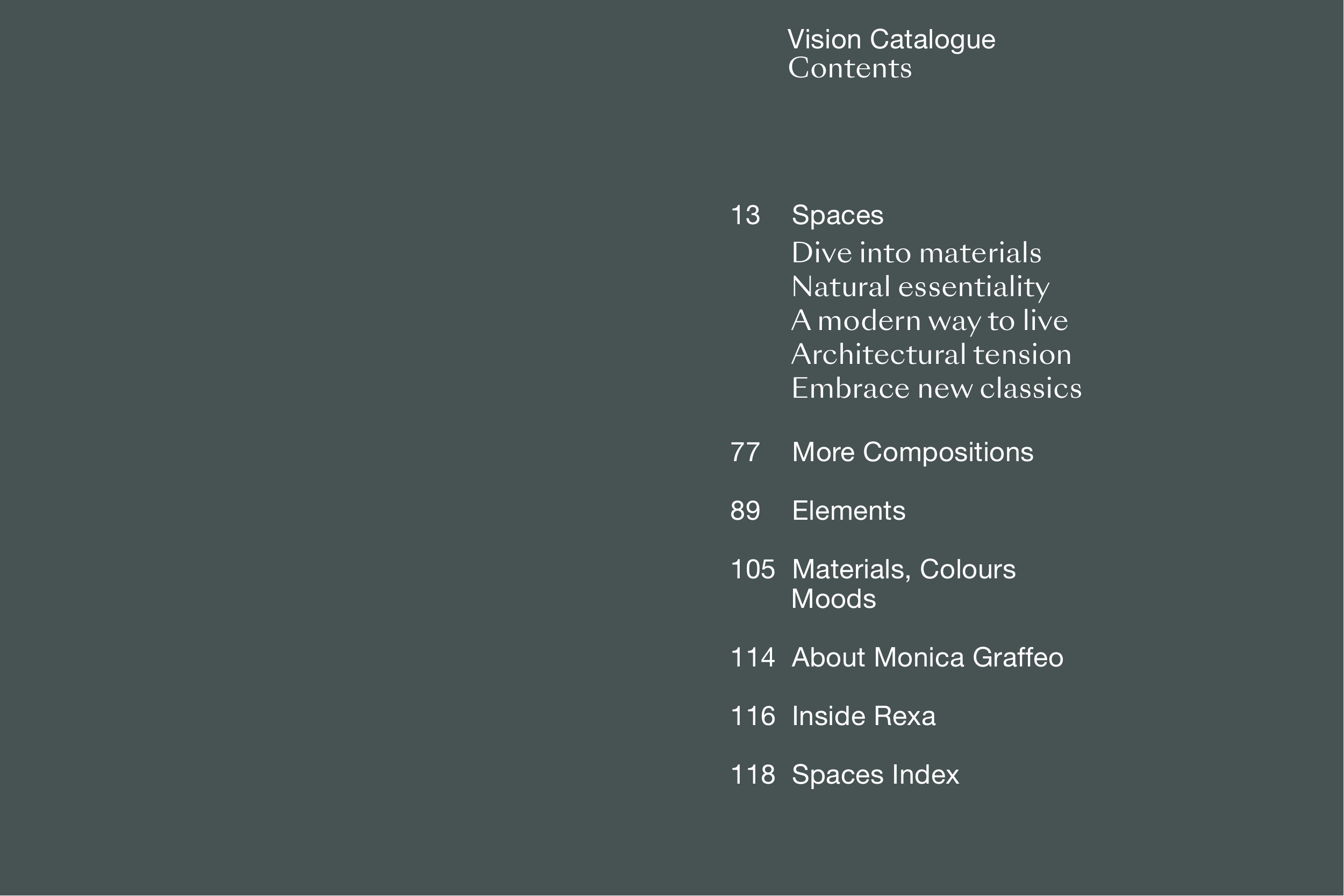 Vision Catalogue Contents 13 Spaces Dive into materials Natural essentiality A modern way to live Architectural tension Embrace new classics 77 More Compositions 89 Elements 105 Materials, Colours Moods 114 About Monica Graffeo 116 Inside Rexa 118 Spaces Index