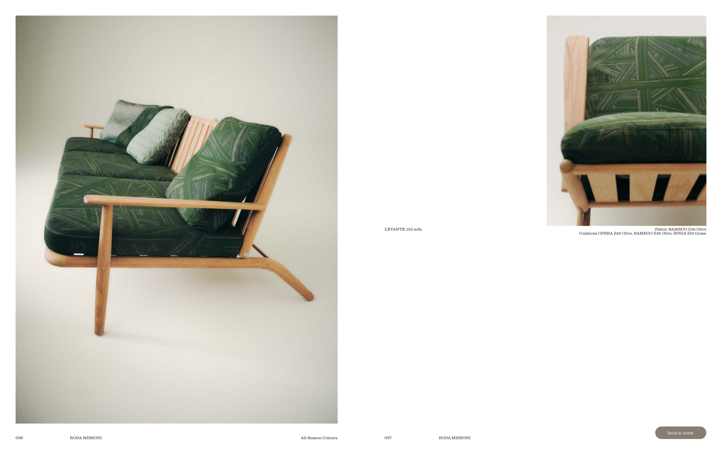 LEVANTE 103 sofa Fabric BAMBOO Z36 Olive Cushions OPERA Z26 Olive, BAMBOO Z36 Olive, SPIGA Z16 Grass 036 RODA MISSONI All-Season Colours 037 RODA MISSONI Back to index