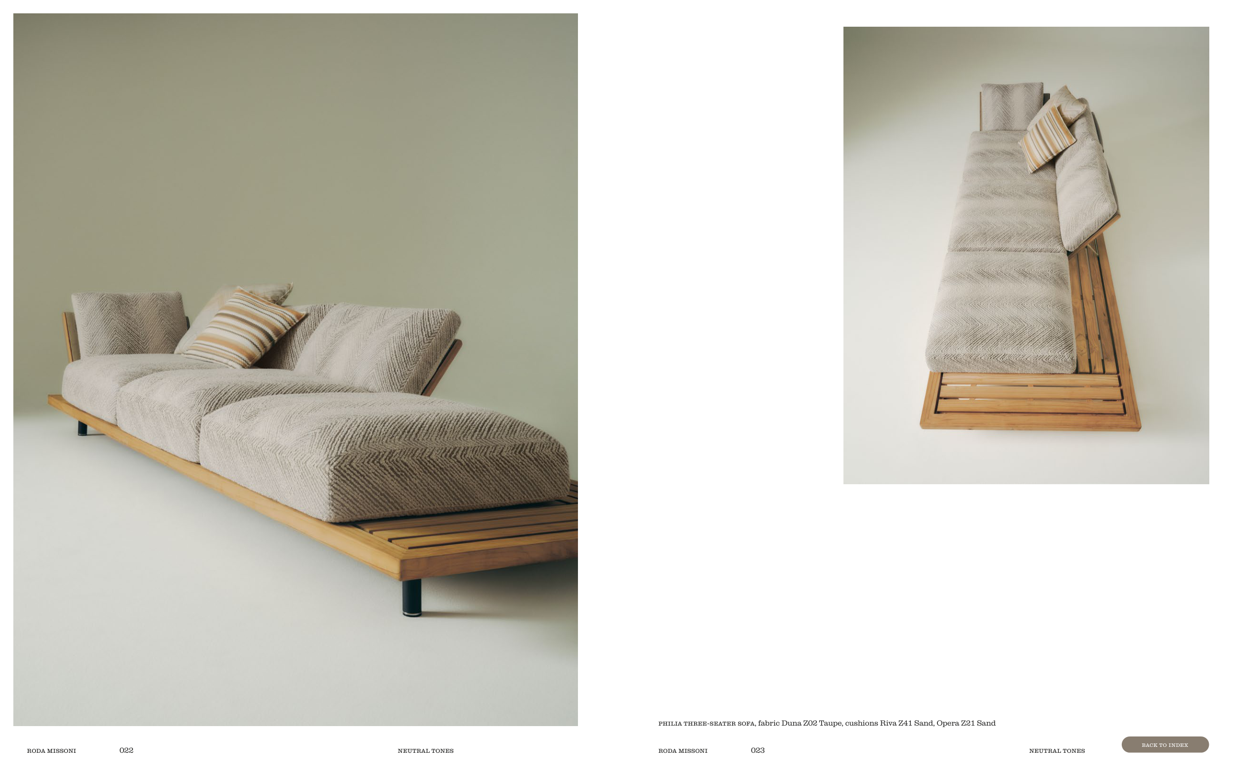 roda missoni 022 neutral tones roda missoni 023 neutral tones philia three-seater sofa, fabric Duna Z02 Taupe, cushions Riva Z41 Sand, Opera Z21 Sand back to index